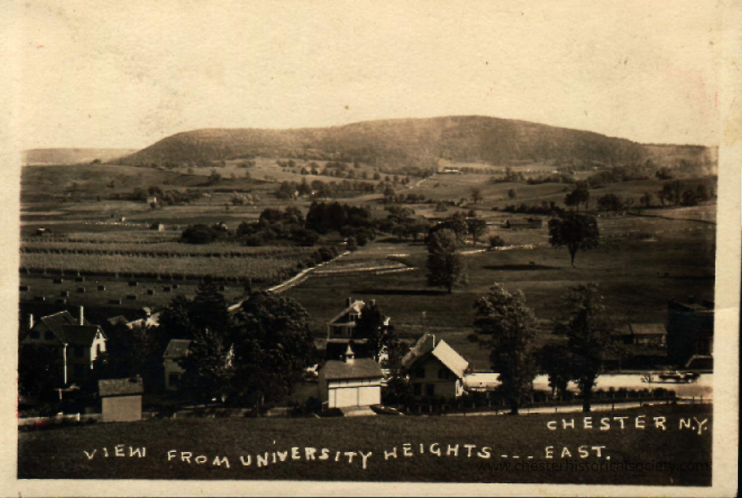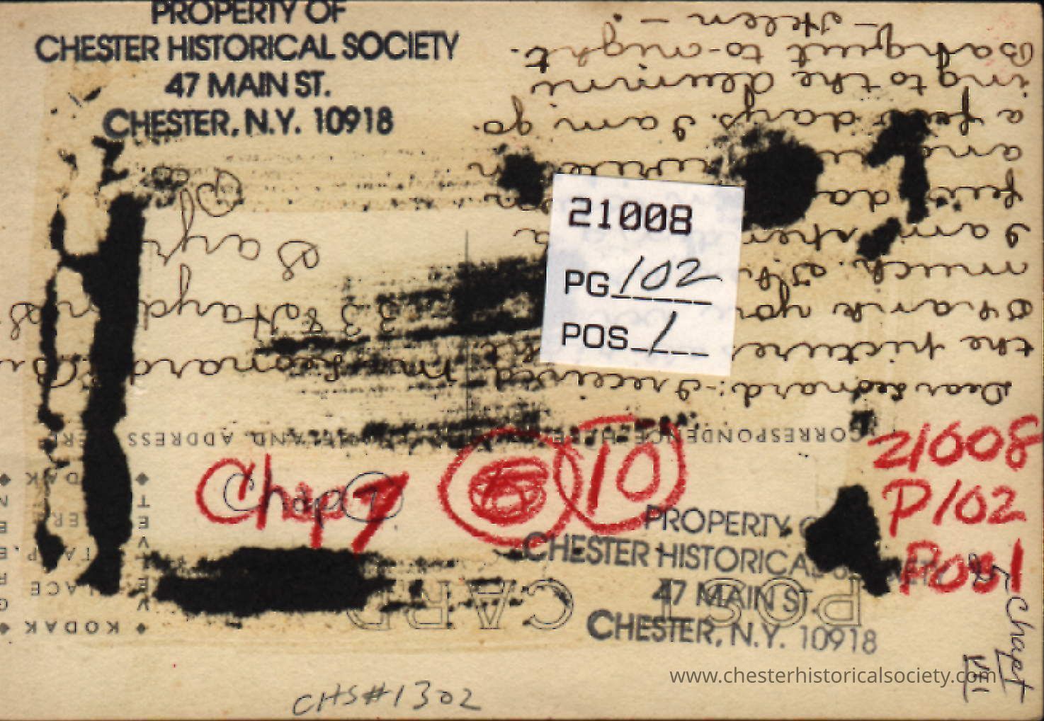 This monochrome photo postcard depicts a panoramic view from "University Heights" in Chester, New York, looking eastward, showcasing a picturesque rural landscape characterized by sprawling farmlands, sporadic clusters of houses, and rolling hills in the background, all rendered in sepia tones, which suggest the photograph's vintage nature, likely dating from the early 20th century. The scene is tranquil, marked by agricultural fields divided by fences and tree-lined paths, providing a glimpse into a pastoral life. The address side with several stamps and markings, identifying it as the property of the Chester Historical Society located at 47 Main St, Chester, N.Y. 10918. The document features overlapping texts in black ink, some obscured by black ink blotches, and red notations visible. A white label is affixed with numbers and the text "PG/102 POS_" indicates that the "View from University Heights" image was used in the 1992 Village of Chester Centennial book.Subject Place