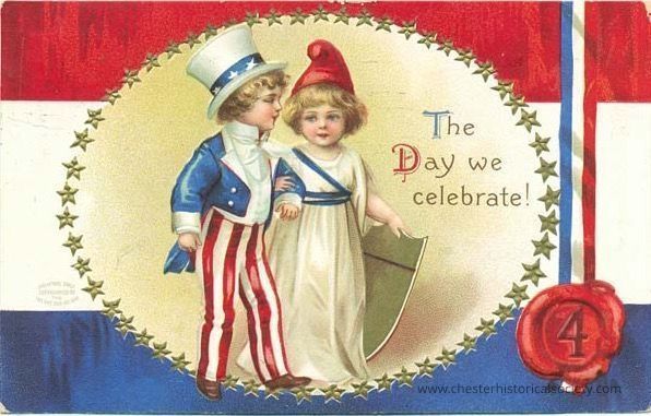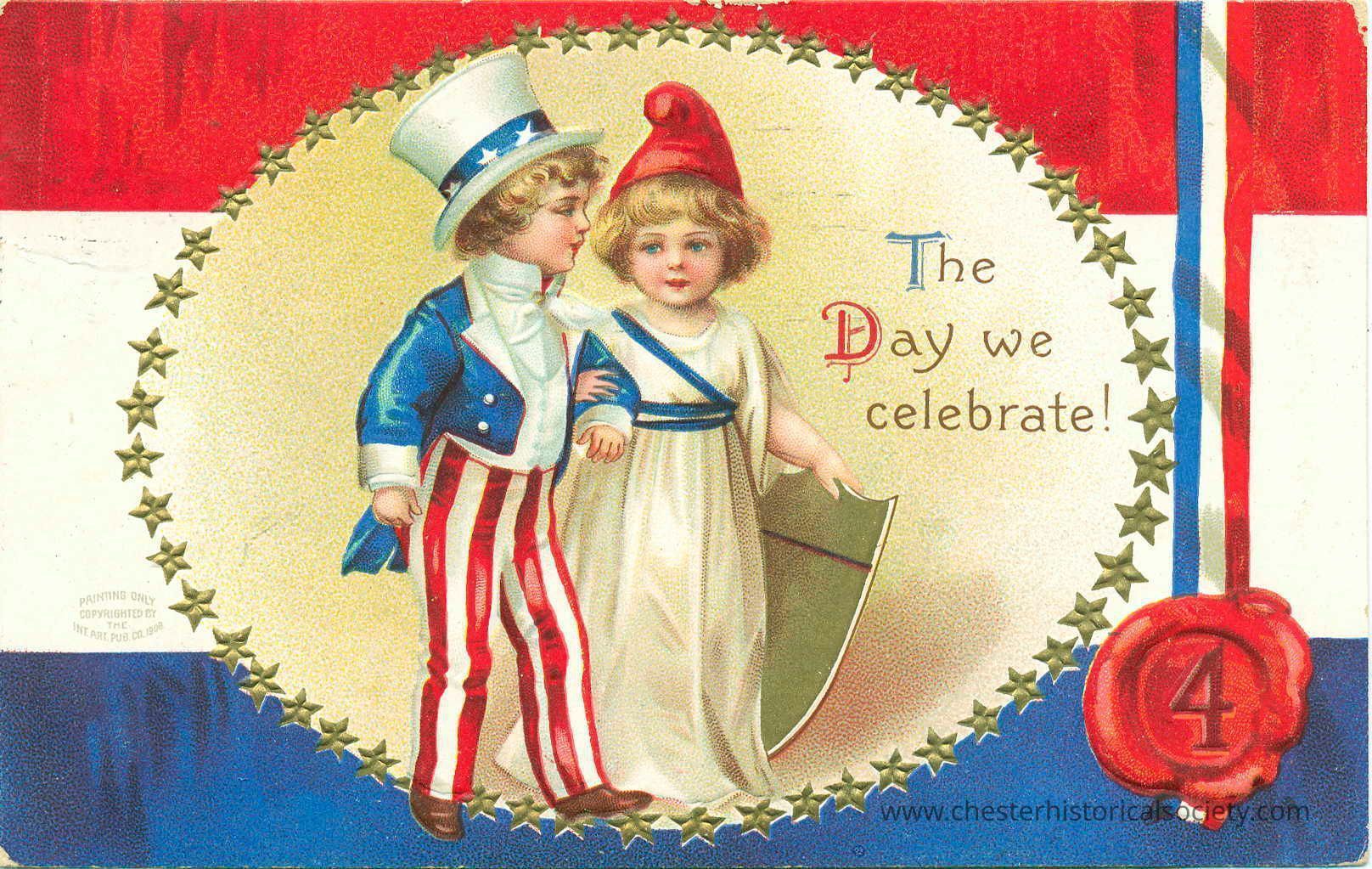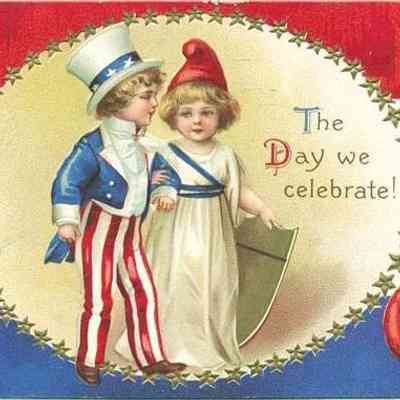 This color greeting postcard depicts two children dressed in patriotic costumes, one wearing an outfit reminiscent of Uncle Sam with a blue jacket, red and white striped pants, and a star-spangled top hat, while the other child in a white dress and red cap holds a shield; they are framed by a circular border with golden stars around it, and beside them is the phrase "The Day we celebrate!" suggesting a Fourth of July or patriotic celebration theme, emphasized by red, white, and blue colors and a red '4' seal hanging at the bottom of a red, white, and blue ribbon.