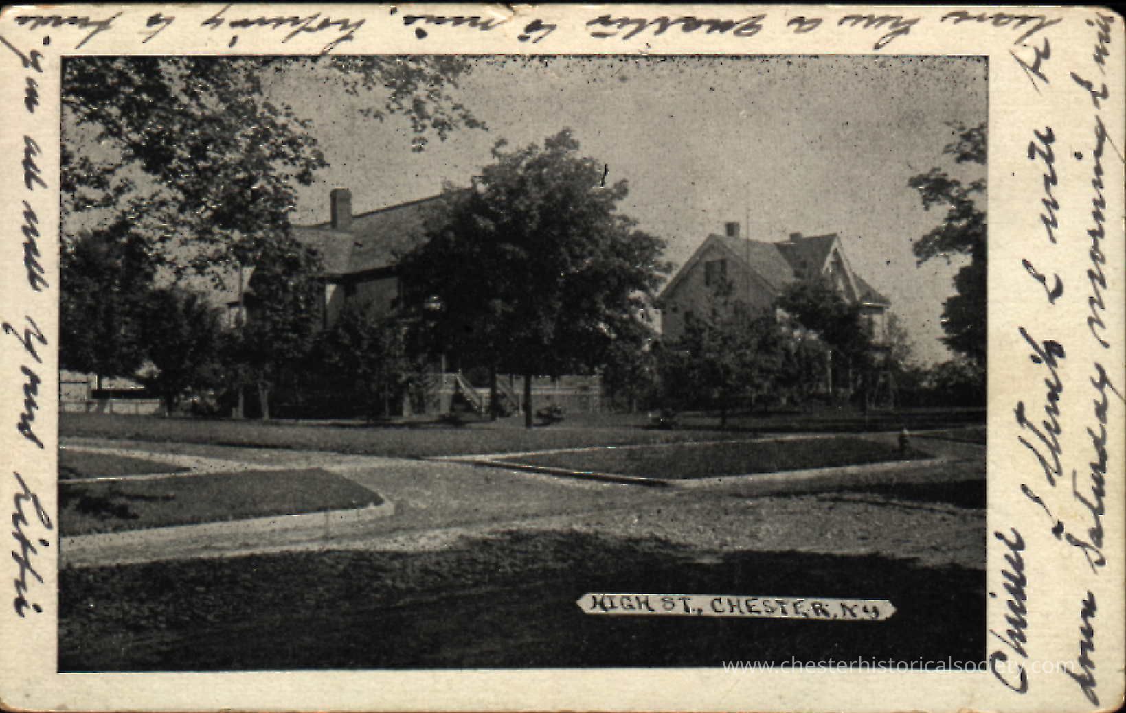 This monochrome photo postcard showcases a peaceful residential street scene from the early 20th century in High St., Chester, N.Y., featuring quaint houses surrounded by mature trees. The house on the left was occupied by William Osborne and his family - the one on the right by John Tyler Thompson and his family. A neatly maintained road splits into paths surrounding a central grassy area. The foreground indicates a quieter time with clear, uncluttered streets. The address side of the postcard was dated April 23, 1908, postmarked in Chester, NY. The postcard features an elegant script and floral design elements in the header, reading "Post Card." It is addressed to Mr. William Masterson at 614 West 136th Street, New York City, NY. The postcard also has a green Benjamin Franklin one-cent stamp affixed to the top right corner. An added after-the-fact notes occupant to the house pictured on the other side.Subject Person/Organization