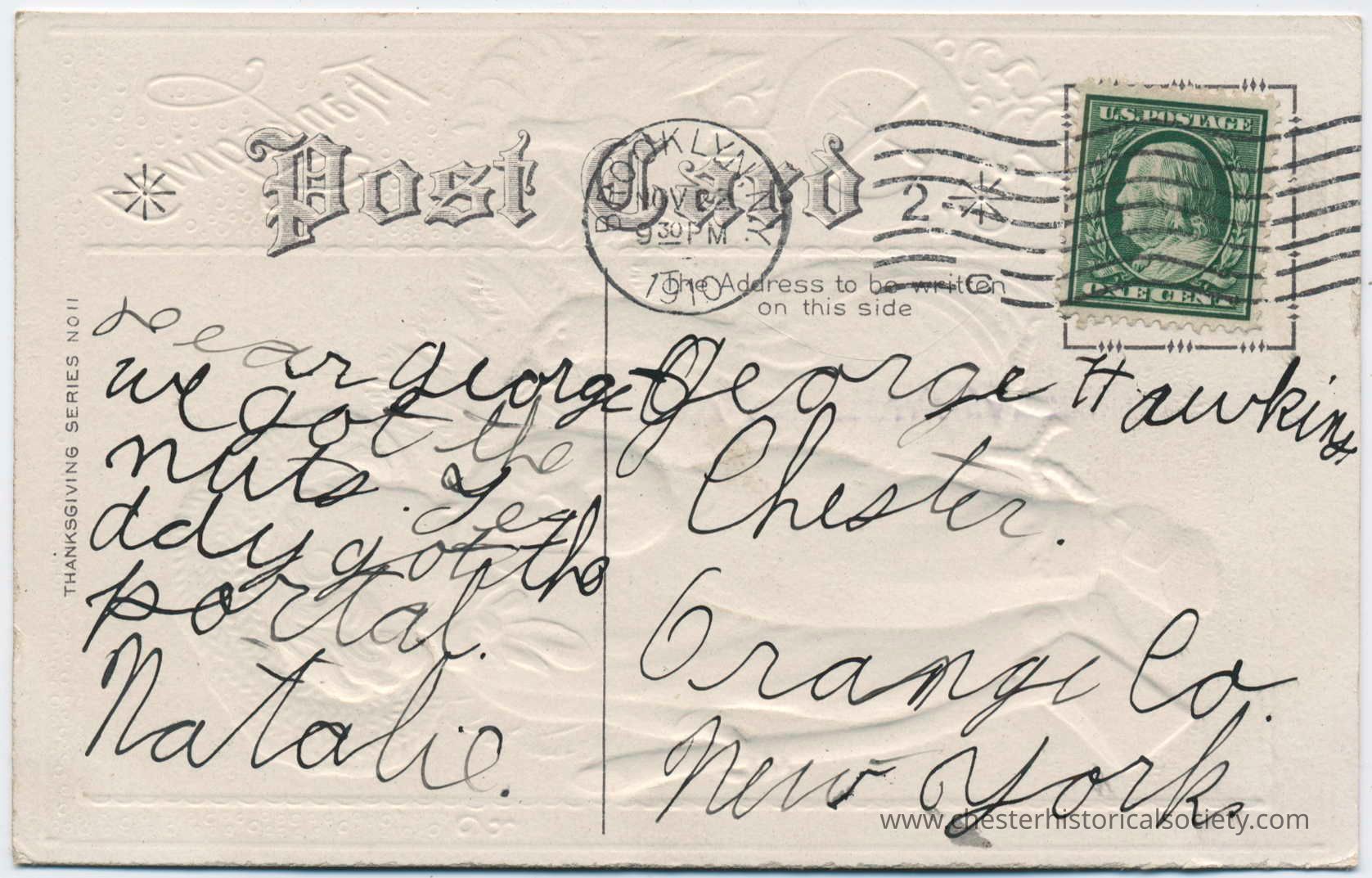 The image shows rreverse postmarked from Brooklyn on November 10th, 1910, with a green one-cent U.S. postage stamp in the upper right corner; it is addressed to George Hawkins in Chester, Orange County, New York, and features a handwritten message from Natalie, mentioning "nuts" and "Today got the portal," with the embossed words "Post Card" and decorative elements around the text.Subject Person/Organization