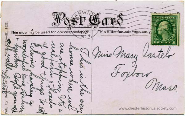 The reverse shows a green one-cent stamp in the top right corner and an address written for Miss Mary Castelo in Foxboro, Massachusetts. The left side of the postcard features handwritten message in cursive text, along with a postmark from Warwick, NY. The card is labeled "POST CARD" with instructions indicating "This side may be used for correspondence" and "This side for address only."Subject Person/Organization