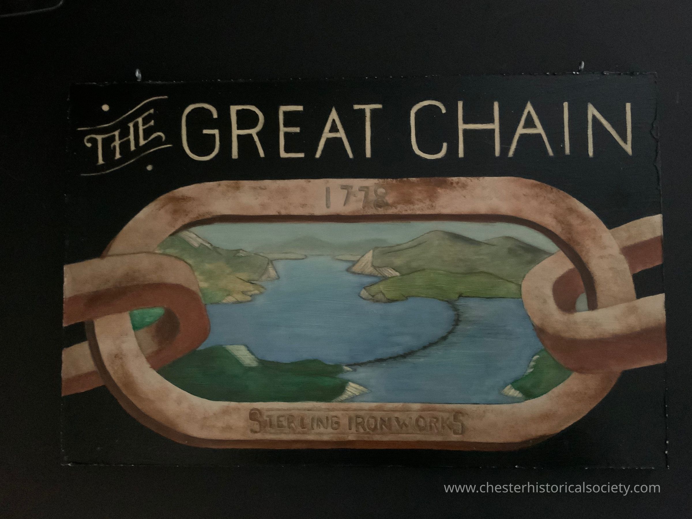 The image features a rustic, painting titled "THE GREAT CHAIN," underscored by the year 1778 and the inscription "Sterling Ironworks" at the bottom. The artwork depicts a robust, rust-toned chain forming an oval frame around a scenic landscape view, portraying two green landmasses separated by a body of blue water. A jagged chain, possibly representing a broken or continuous connection, spans across the water between the two shores, emphasizing the historical significance and perhaps a literal or metaphorical barrier. The pairing appears aged, with visible wear and fading that adds to its antique charm, commemorating a significant event and location from the past.