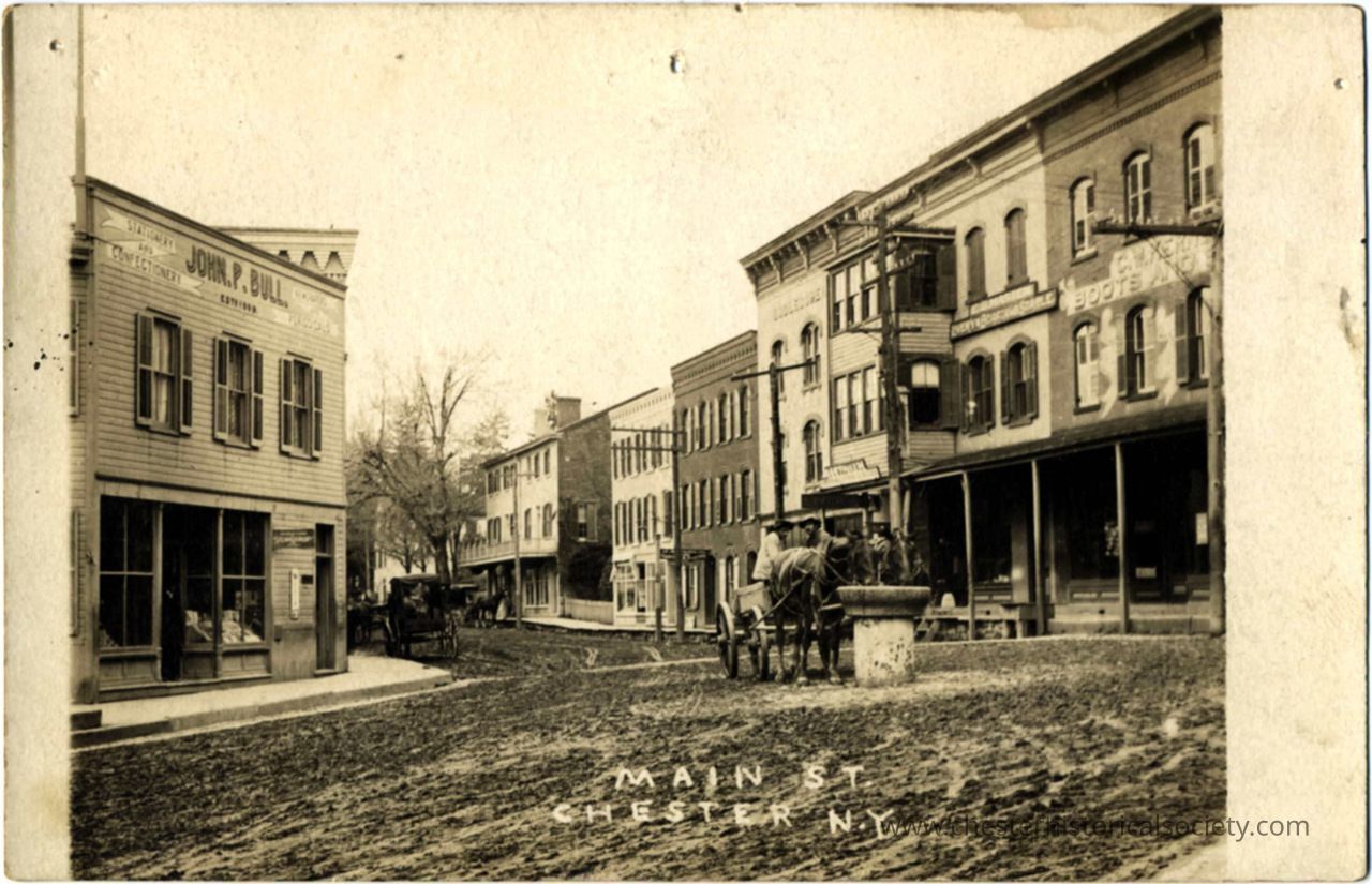 This monochrome photo postcard depicts a bustling Main Street scene from Chester, NY, featuring horse-drawn carriages and people milling about, surrounded by multi-storied brick buildings with various business signage, including "John P. Bull, Stationery," watering trough, and stepped wooden sidewalk on the west side of the dirt Main Street.Subject Place