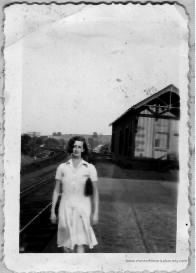 Mary Brandt seeing her son, Robert (Bobby) Brandt off from the Chester Erie Depot in 1943 for WWII service in Navy. 1842 Station in background, then used as the freight depot.Photograph Details