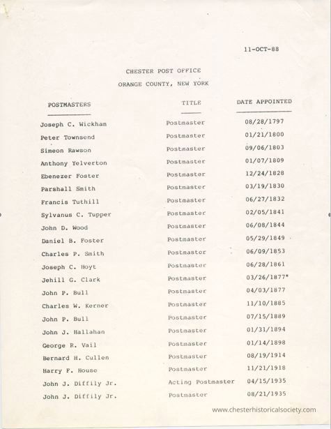 An abstract of Chester Post Office Postmasters from 1797 to 1935 compiled by Bill Durland.Subject Person/Organization