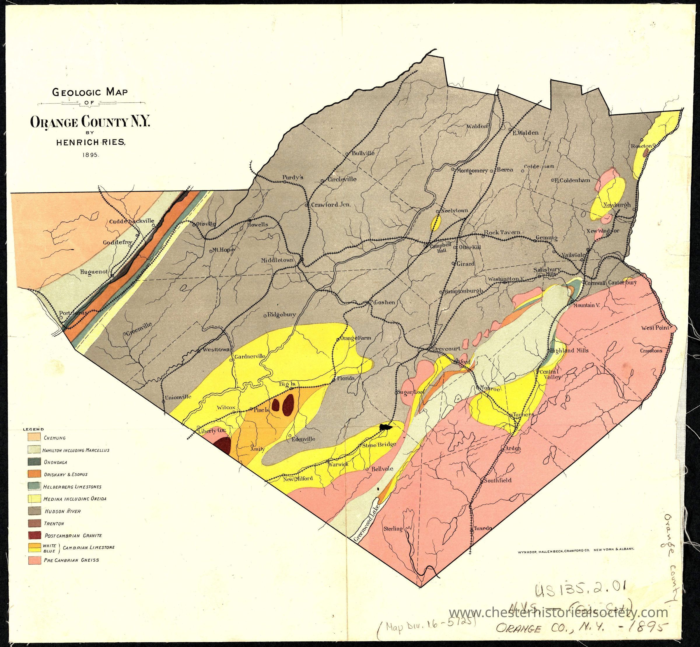 This geologic map of Orange County, NY, created by Heinrich Ries in 1895, illustrates the geology of Orange County.Category