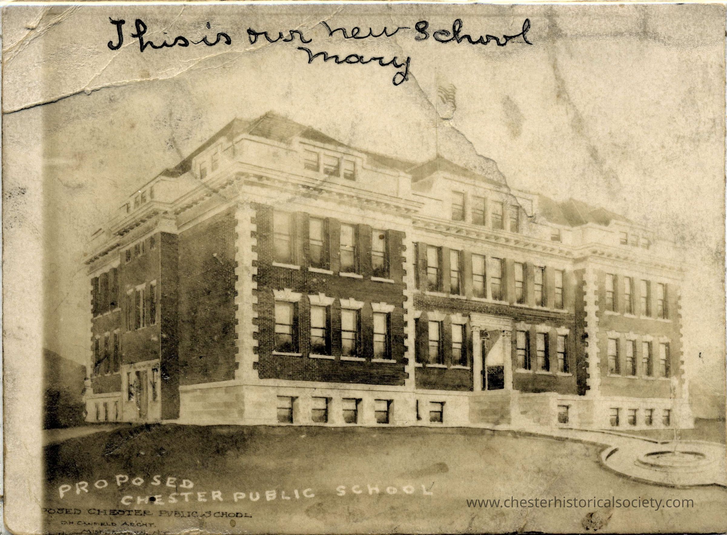 This postcard displays an old, sepia-toned architectural rendering of the proposed three-story Chester Public School building, featuring an American flag atop and clear, distinct architectural details. Handwritten text on the top left corner says "This is our new school Mary." Below, the building's impressive facades and arched windows reflect typical early 20th-century public school architecture in the United States. The address side of the "Proposed Chester Public School" postcard features a canceled one-cent Benjamin Franklin stamp in green, postmarked from Rochester, NY, dated 6 PM, Aug 23, 1905. The postcard is addressed to "[M]iss M[unreadable] Curtis" at "182 - 18 St, Jersey City, N.J." The upper left corner has handwritten notes, and the card has aged with some stains and a torn top left corner.Subject Person/Organization