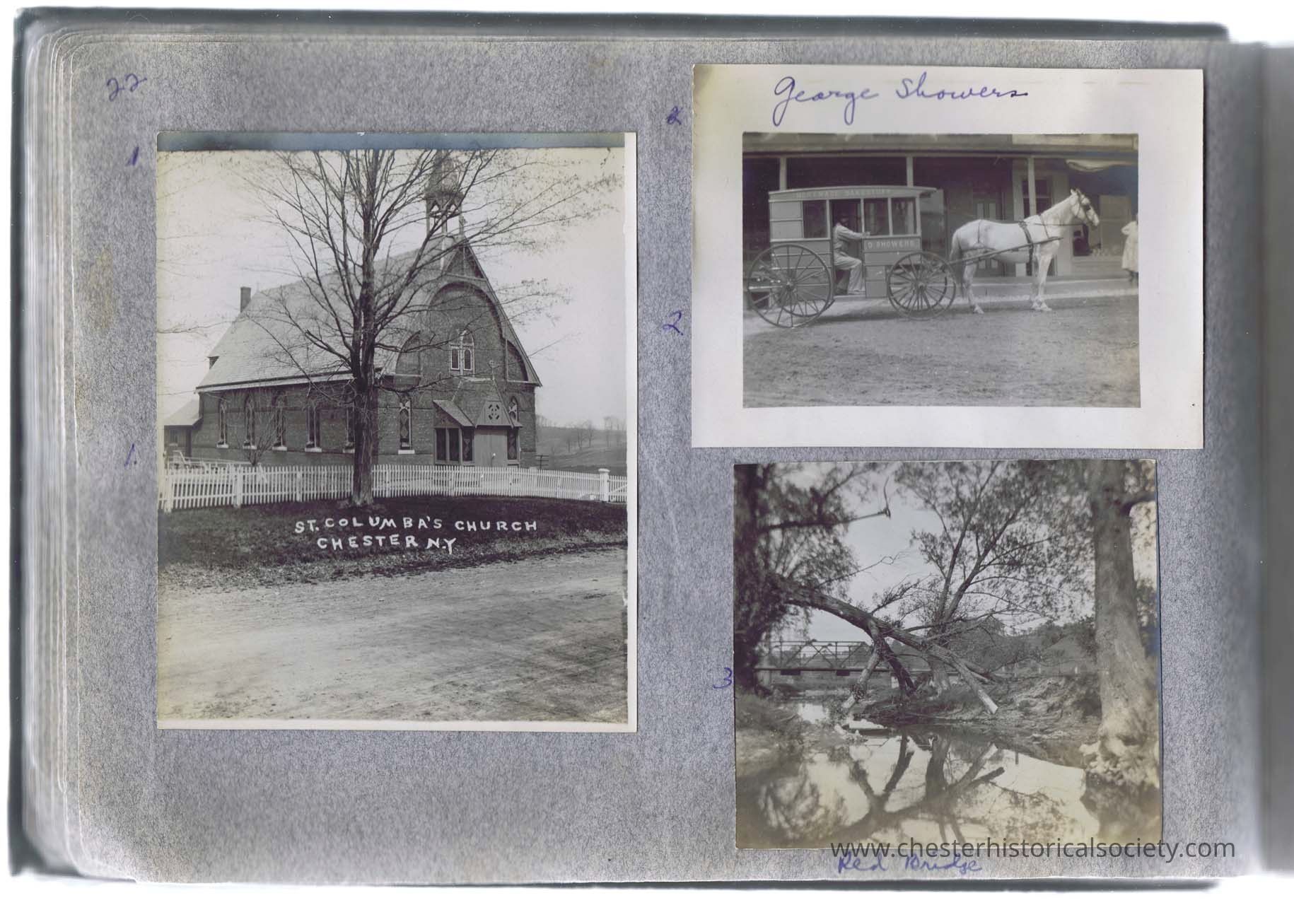 page 22 1-St. Columba's Church, Chester N.Y. (first one); 2-George Showers (in wagon) Homemade Bakestuff G. showers; 3-Red Bridge