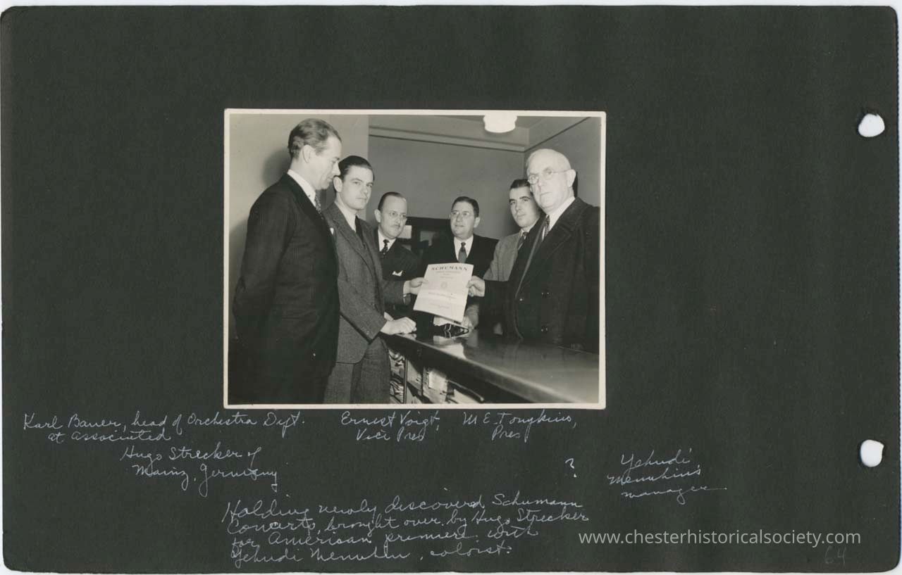 64 Karl Burer, head of Orchestra Dept. at Associated; Ernest Voigt, Vice Pres.; M.E. Tomkpins, Pres; Hugo Strecker of Mainz, Germany; ?; Yehudi Menuhins, Manager; holding newly discovered Schumann concerts, brought over by Hugo Strecker for American premiere with Yehudi Menuhins, soloist.