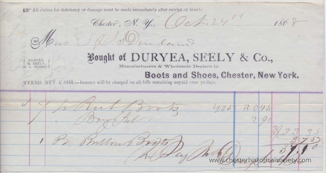 1868 - Duryea and Seely, J. Duryea, T.G. Seely, H.L.Adaams - Mfg. of Boots and Shoes