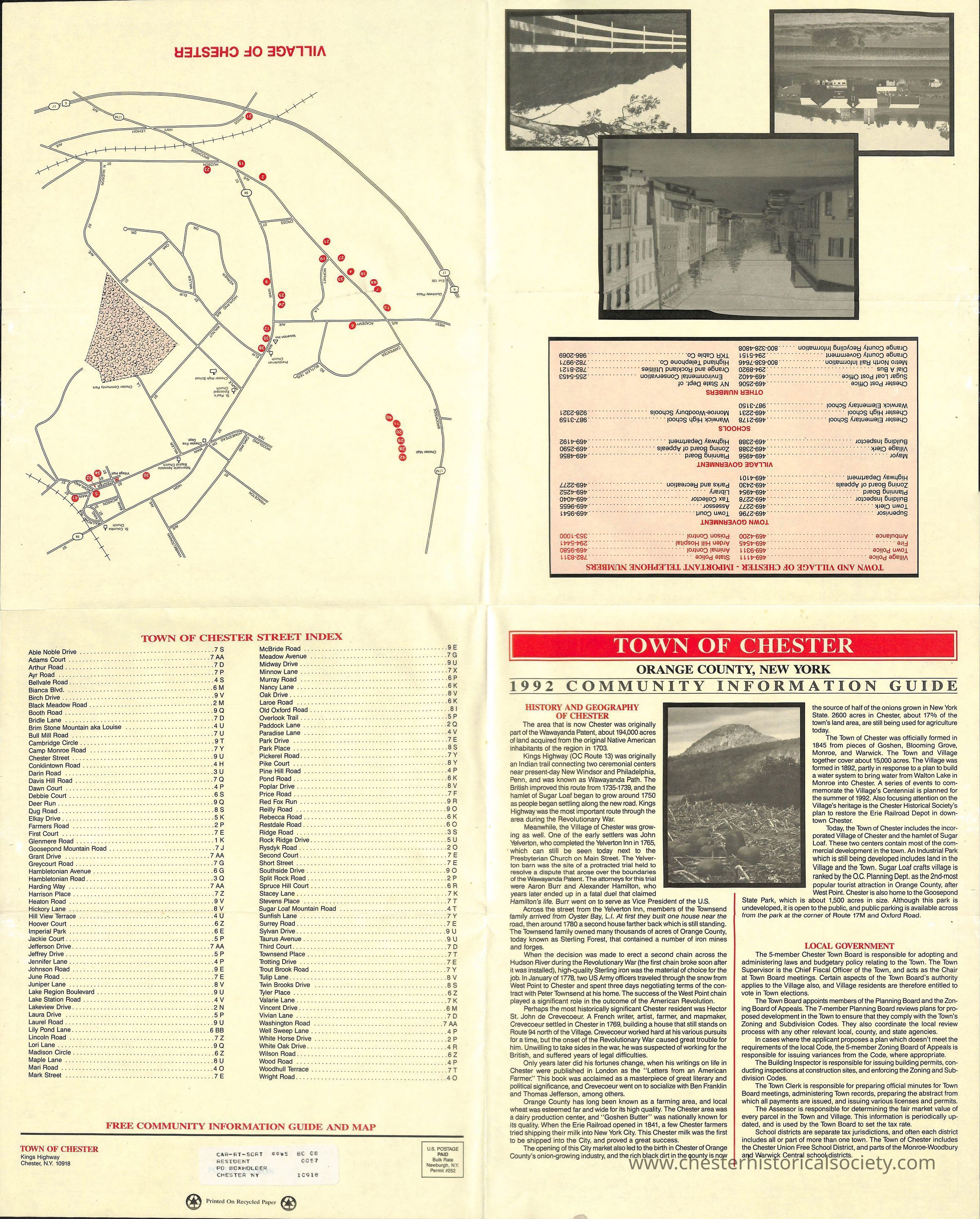 The Town of Chester was officially formed in 1845 from pieces of Goshen, Blooming Grove, Monroe, and Warwick. The Town and Village together cover about 15,000 acres. The Village was formed in 1892, partly in response to a plan to build a water system to bring water from Walton Lake in Monroe into Chester. A series of events to commemorate the Village's Centennial is planned for the summer of 1992. Also focusing attention on the Village's heritage is the Chester Historical Society's plan to restore the Erie Railroad Depot in downtown Chester.