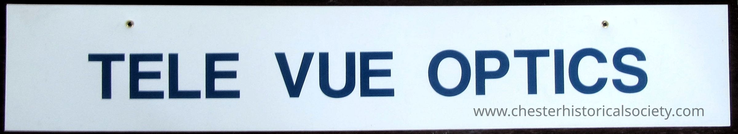 A white sign with the bold text "TELE VUE OPTICS" in blue.Collection