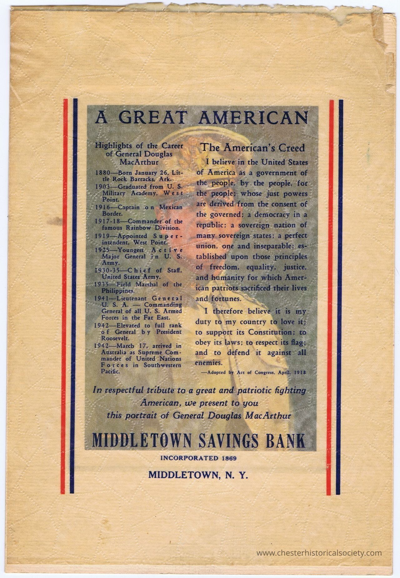 Avintage advertisement from Middletown Savings Bank, dedicated to General Douglas MacArthur, with a semitransparent overleaf highlighting his career milestones and containing "The American’s Creed," which emphasizes the values of democracy, freedom, and patriotism in the United States. The left side lists key achievements in MacArthur’s career from 1880 to 1942, such as his birth in Little Rock and his elevation to full rank by President Roosevelt. The right side features "The American’s Creed," expressing a belief in the Untited States of America.Collection