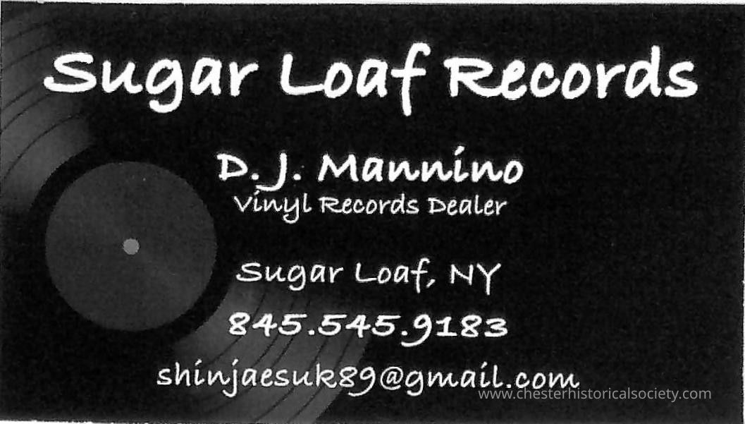 A business card for Sugar Loaf Records, detailing: D. J. Mannino, Vinyl Records Dealer at Sugar Loaf, N.Y.Category