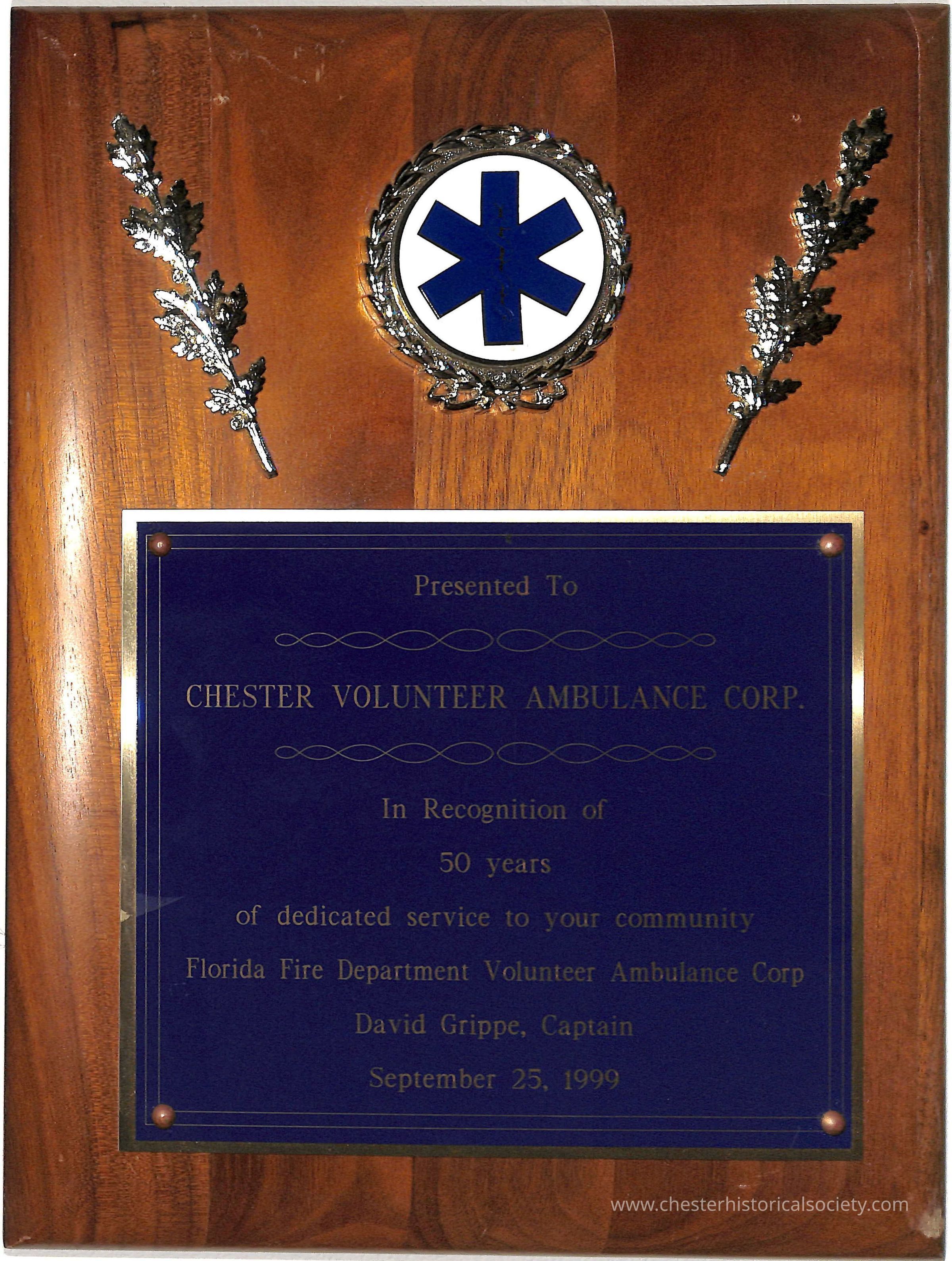 The plaque presented by the Florida Fire Department Volunteer Ambulance Corp honors Chester Volunteer Ambulance for 50 years of dedicated community service.Collection
