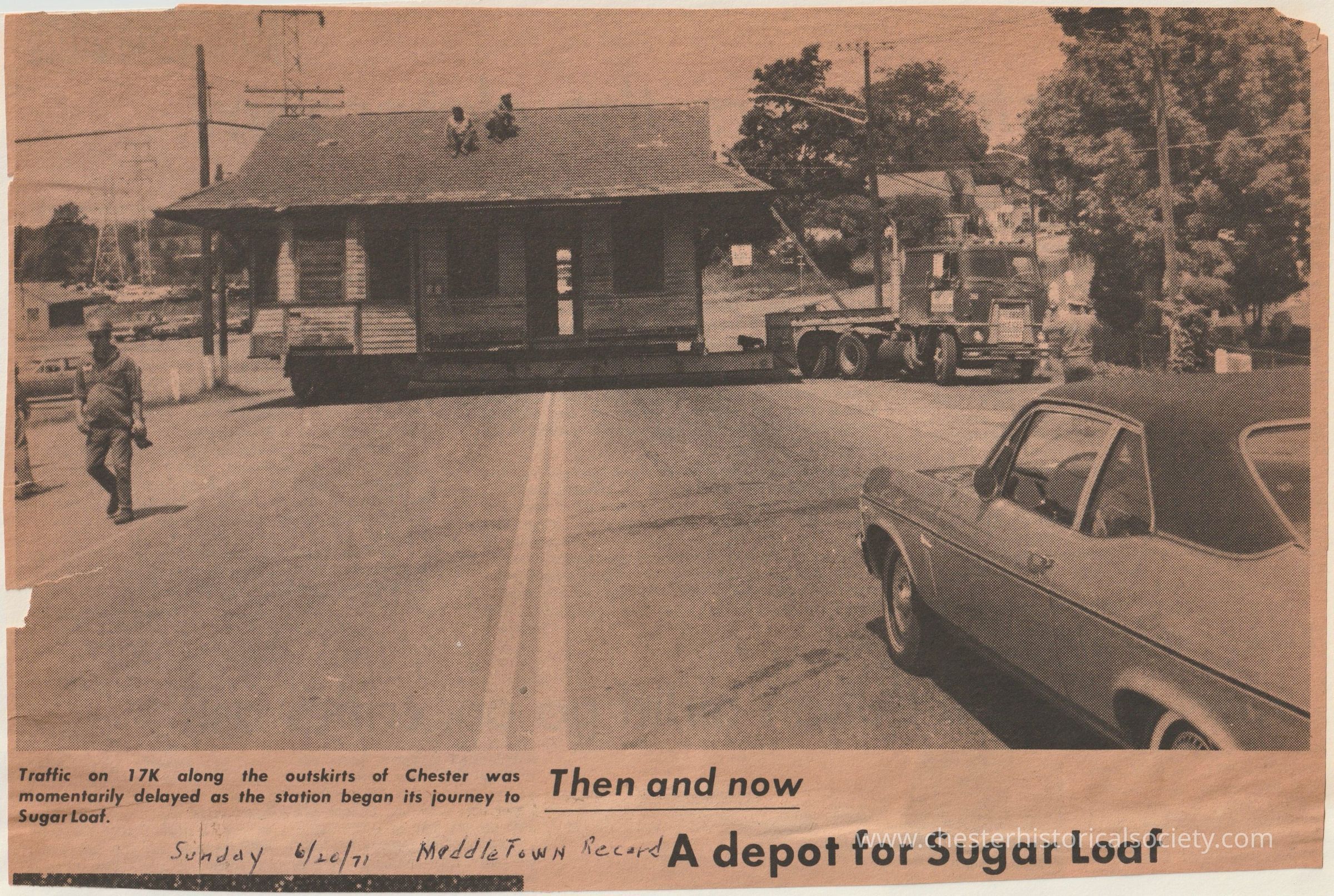 Middletown Sunday Record clipping reporting on the old East Chester L&HRR depot being moved to Sugar Loaf, where it will be renovated and house a new craft shop.Category