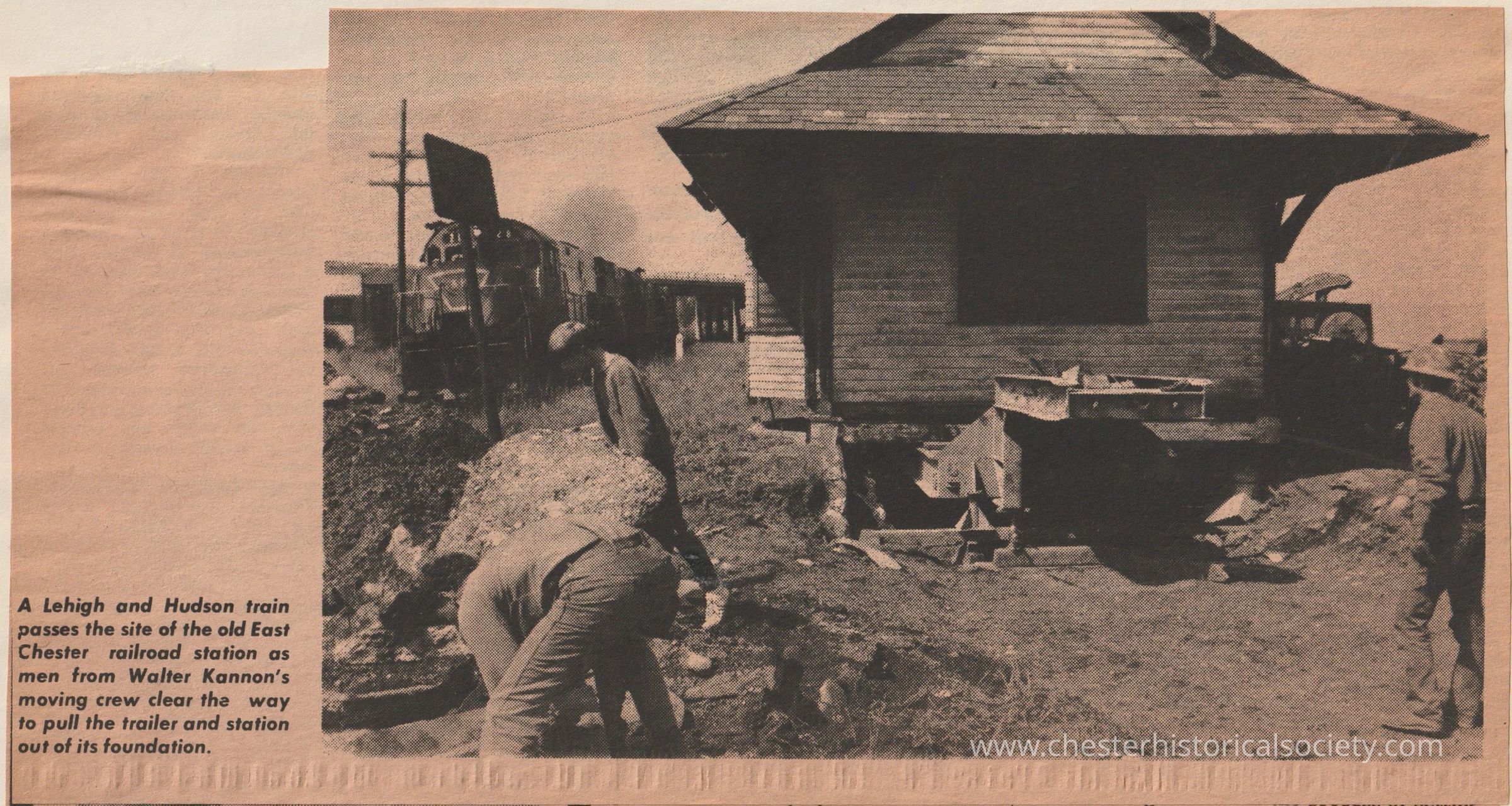 [photo caption] A Lehigh and Hudson train passes the site of the old East Chester railroad station as men from Walter Kannon's moving crew clear the way to pull the trailer and station out of its foundation.