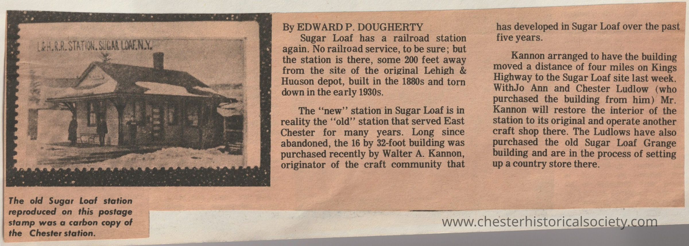 Sugar Loaf has a railroad station again. No railroad service, to be sure; but the station is there, some 200 feet away from the site of the original Lehigh & Hudson depot, built in the 1880s and torn down in the early 1930s. The "new" station in Sugar Loaf is in reality the "old" station that served East Chester for many years. Long since abandoned, the 16 by 32-foot building was purchased recently by Walter A. Kannon, originator of the craft community that has developed in Sugar Loaf over the past five years. Kannon arranged to have the building moved a distance of four miles on Kings Highway to the Sugar Loaf site last week. With Jo Ann and Chester Ludlow (who purchased the building from him) Mr. Kannon will restore the interior of the station to its original and operate another craft shop there. The Ludlows have also purchased the old Sugar Loaf Grange building and are in the process of setting up a country store there.Create Date