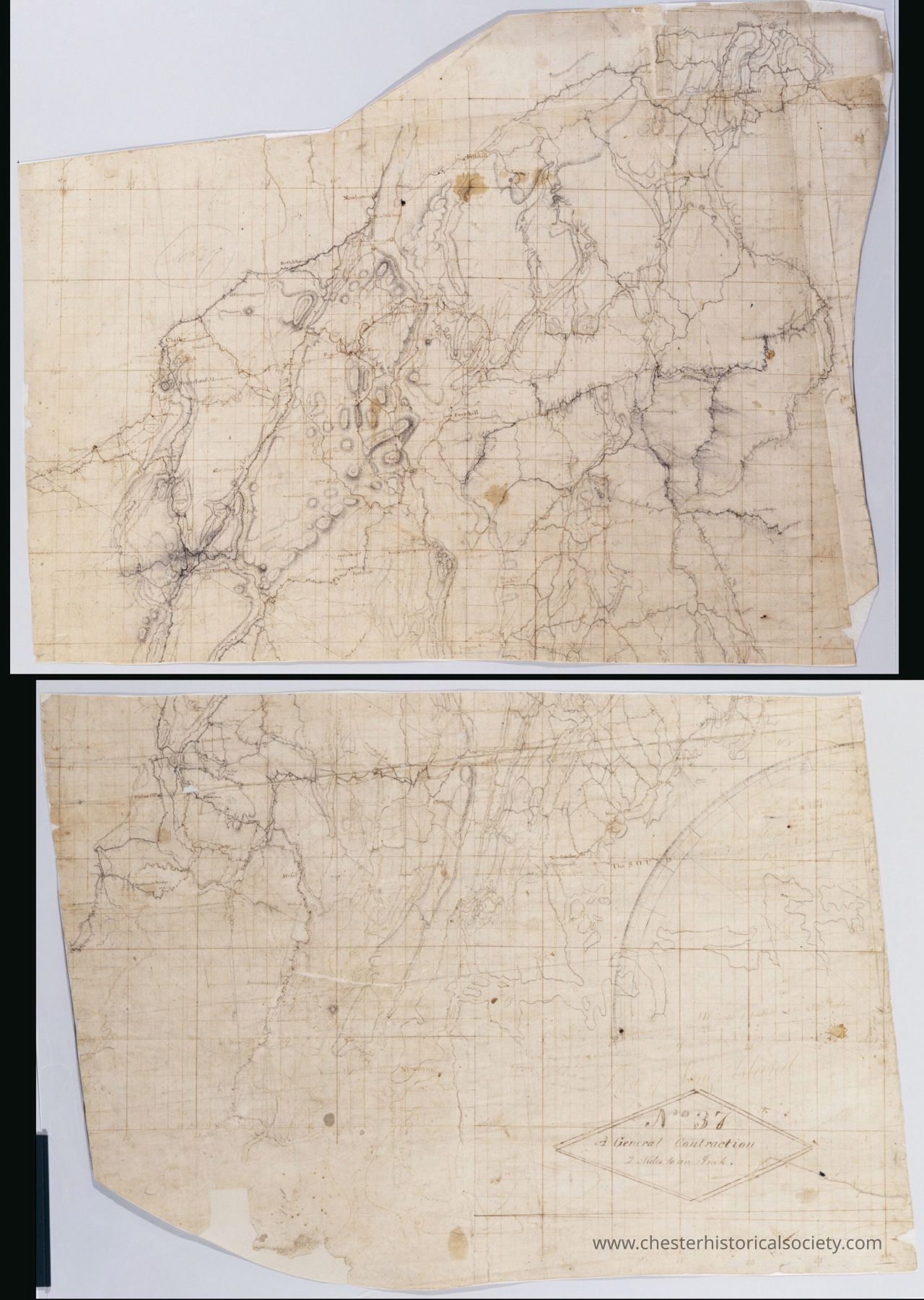 This General Contraction Map 2 Miles to an Inch. No 37 _ by R.E. ; by Robert Erskine F.R.S. Geogr. A. U.S. and Assistants displays two adjacent sections of an old, weathered map with faint grid lines and a series of intricate ink-drawn pathways and terrains, showcasing detailed topographical features such as hills, valleys, and rivers from New York City to Fishlill.Description