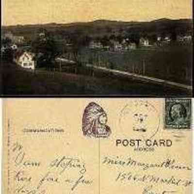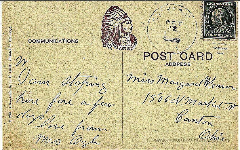 This colorized photo postcard shows a view of Greycourt, New York, featuring scattered houses and mountains on the horizon. The address side features handwritten text, a one-cent U.S. postage stamp, and a cancellation mark on the right. On the left are "Communications" - a brief message signed "Mrs. Ogle." The card is addressed to Miss Margaret Weaver of Canton, Ohio.Subject Place