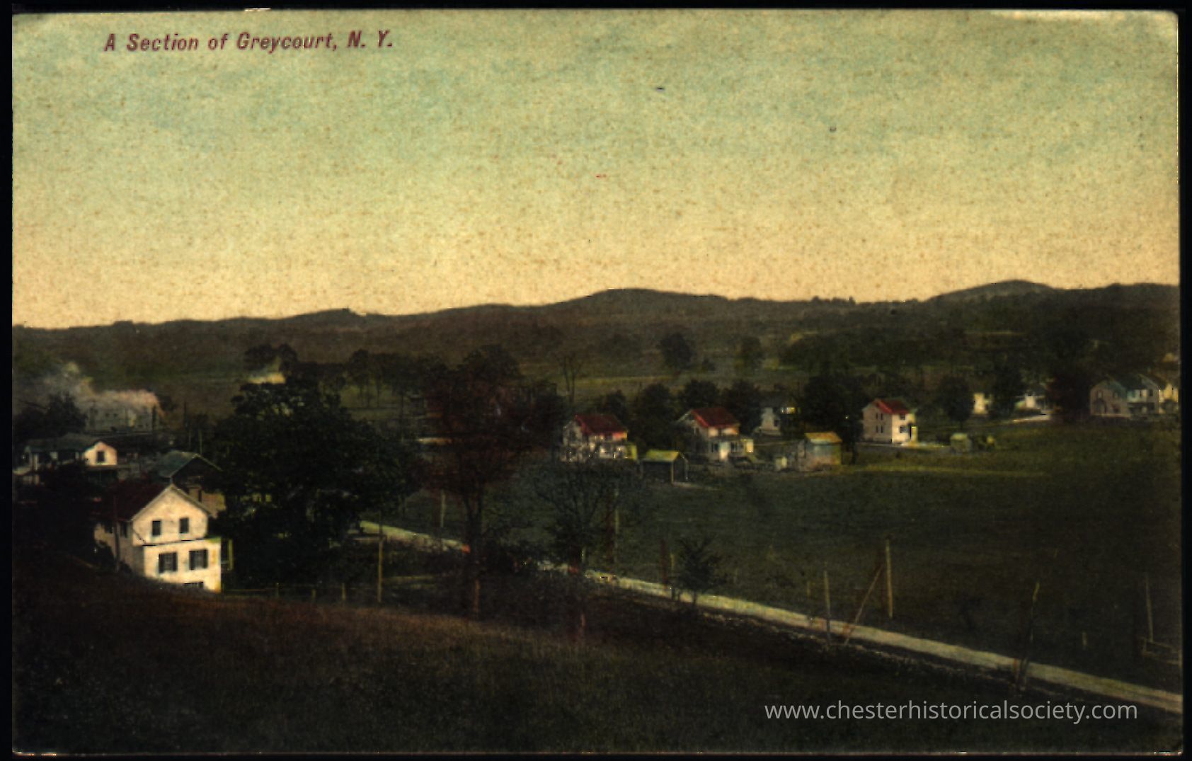 Divided back post card of A Section of Greycourt, Chester, Orange County, New York. Postmarked Greycourt, Published by E.G. Littel. View is looking down toward Erie and Lehigh & Hudson railroad tracks and the "Black Dirt" farm fields in the distance. Road in foreground is Oxford Road. Five houses in distance are along Greycourt Road,