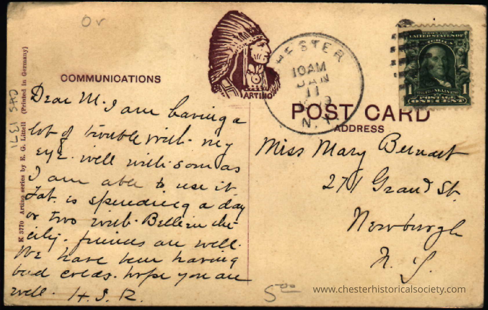 This colorized photo postcard shows a view of Greycourt, New York, featuring scattered houses and mountains on the horizon. The address side of the "A Section of Greycourt, Chester, N. Y." postcard dated January 11, 1909, with a green one-cent stamp featuring Benjamin Franklin. It is addressed to Miss Mary Bernart at 271 Grant St., Newburgh, N.Y. The postmark reads 'Chester N.Y.'. The postcard features handwritten notes expressing the sender's current engagements, health status, and well wishes, with the logo of the Artino Post Card Co., a Native American in traditional headdress.Subject Place