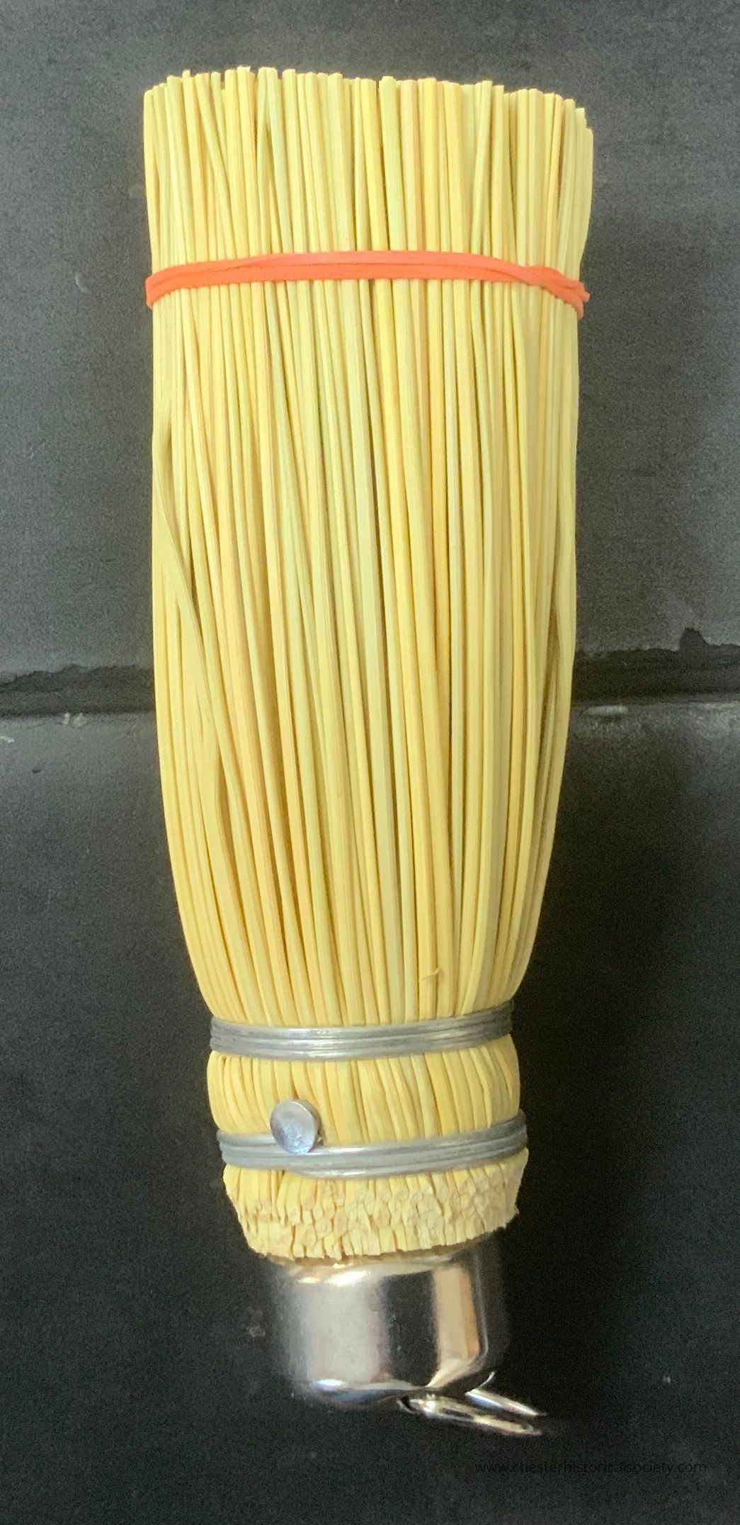 This image shows a bundle of yellow broom bristles secured with a red rubber band and metal attachment