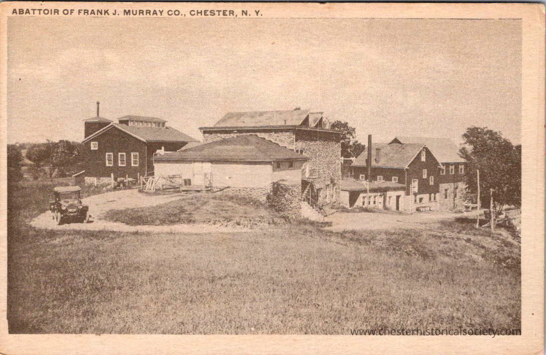 The image presents a historical view of the Abattoir of Frank J. Murray Co., located in Chester, New York. This black and white photograph captures an expansive rural setting with several large buildings that likely functioned as part of the slaughtering and processing operations. The architecture is typical of industrial facilities from the early 20th century, with varying rooflines and what appears to be a mix of stone and wooden construction. In the foreground, a classic automobile adds to the historical ambiance, suggesting the era in which this photo was taken. The landscape is predominantly open fields with scattered vegetation, emphasizing the rural nature of the location. The image serves as a historical document detailing the industrial and agricultural heritage of the region.