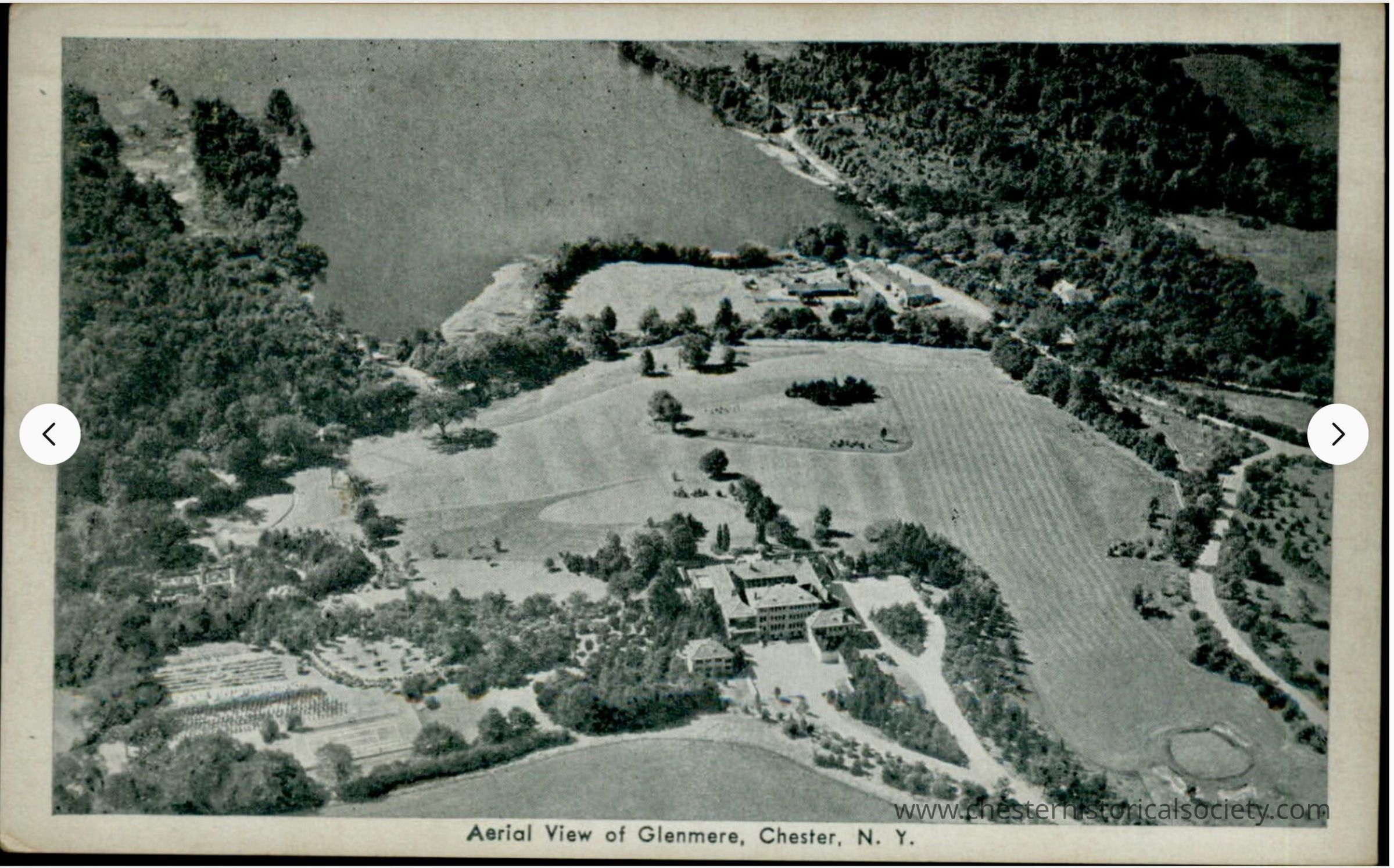 The aerial image showcases a scenic view of Glenmere, Chester, N.Y., highlighting a charming landscape characterized by expansive green fields and numerous clusters of trees that contribute to the region’s natural beauty. A large body of water can be seen adjacent to the landscape, bordered by dense clusters of trees, adding to the serene atmosphere. Among the prominent features is a sizable building complex nestled among the greenery, possibly a historic mansion or estate, surrounded by meticulously arranged gardens and pathways that underscore the architectural significance and elegance of the area. The overall scene is a harmonious blend of nature and architecture, offering a glimpse into the region’s tranquil and picturesque environment, making it an ideal representation of the serene beauty found in this part of New York.