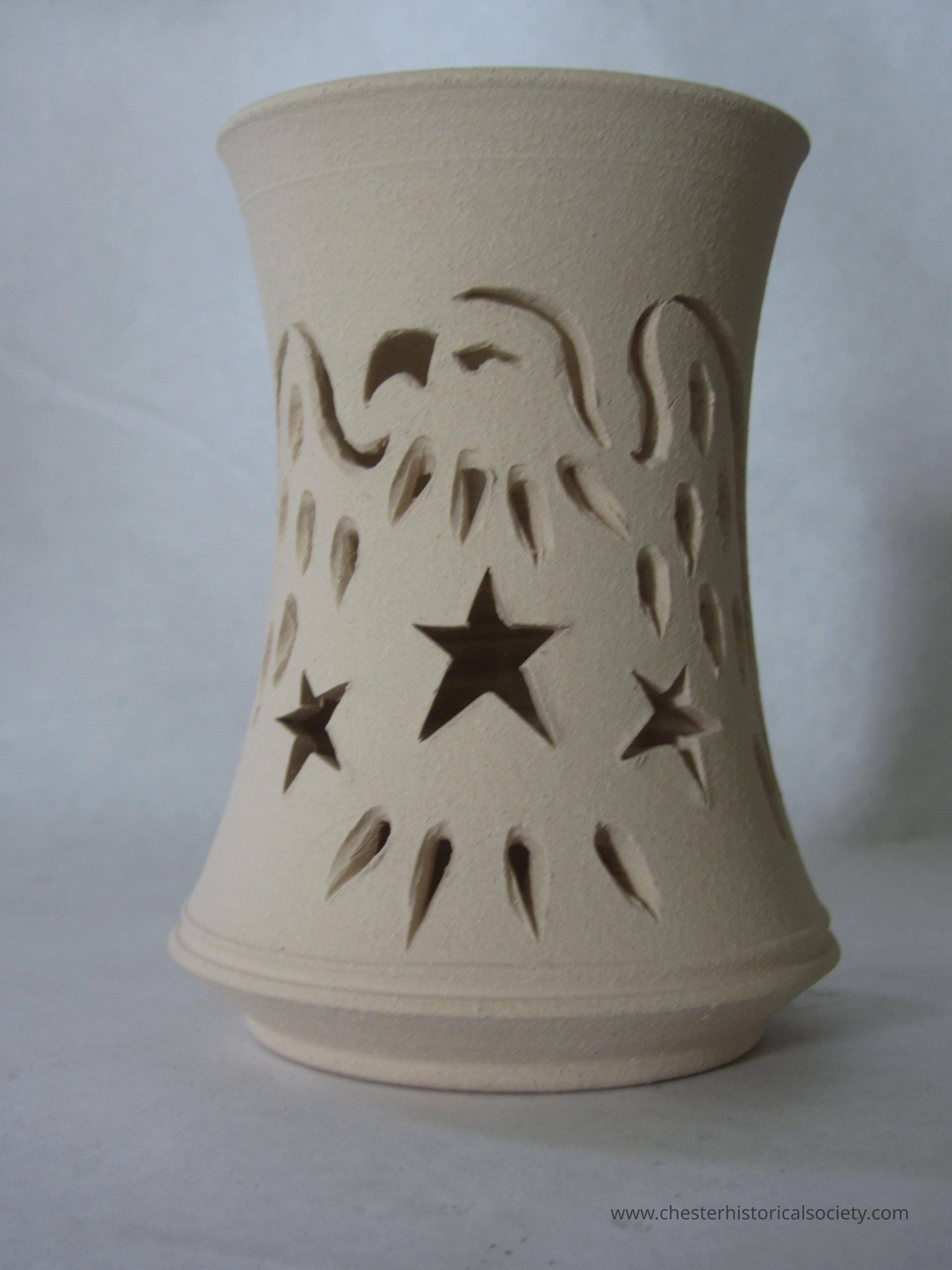 Americana Tealight - a beige ceramic vase features star and eagle cutouts, creating decorative patterns on its surface.Acquisition