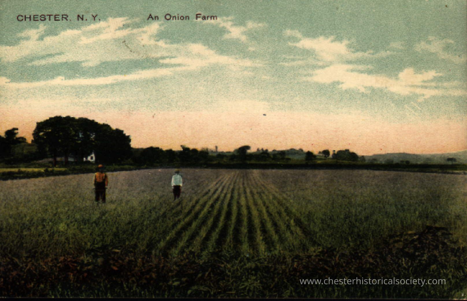 This vintage colorized postcard depicts an expansive onion farm in the Chester Meadows (Black Dirt), showcasing two individuals standing amid the neatly arranged rows of crops under a vast sky at dusk, highlighting the agricultural landscape and the pastoral beauty of early 20th-century rural America.Subject Place