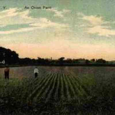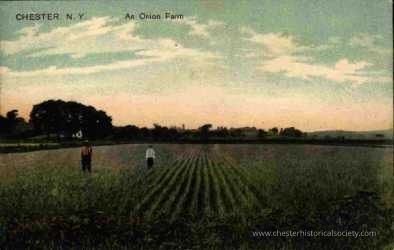 This vintage colorized postcard depicts an expansive onion farm in the Chester Meadows (Black Dirt), showcasing two individuals standing amid the neatly arranged rows of crops under a vast sky at dusk, highlighting the agricultural landscape and the pastoral beauty of early 20th-century rural America.