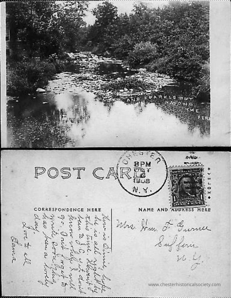 5 1/2 x 3 1/2 inch monochrome postcard of stream scene. Chester NY Postmark