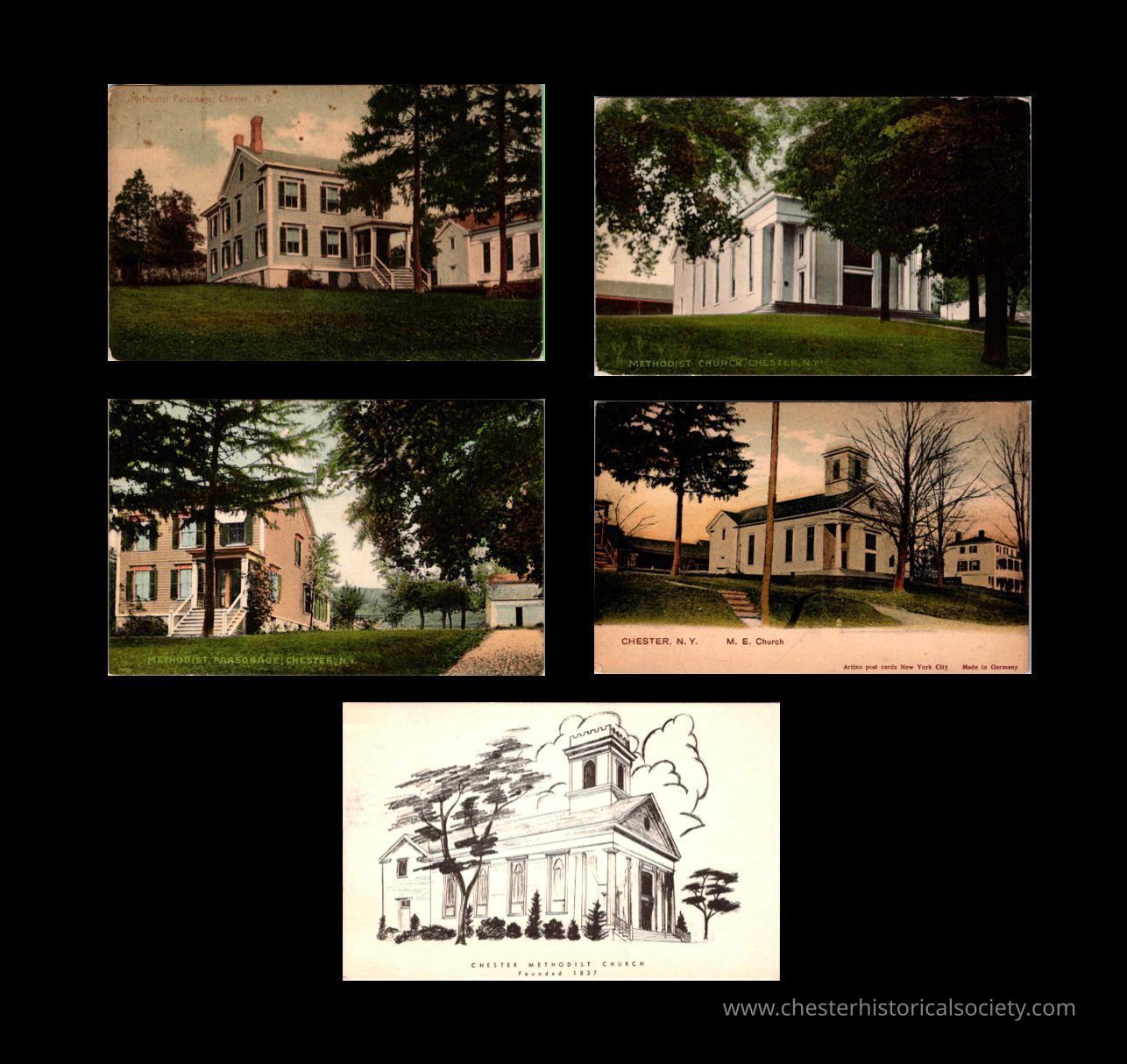 A group of postcards from the Ann and Gene White Collection depicting the Methodist Church in Chester NY in the early 20th Century.Subject