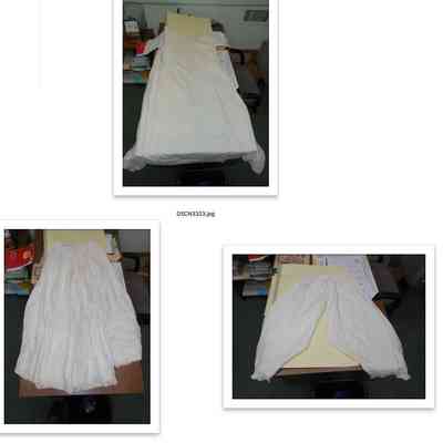 The images depict three white garments displayed on tables. The first image shows a long-sleeved, full-length gown arranged neatly on a table. The second image features a long, white skirt with pleats. The third image displays a pair of loose white bloomers, also positioned on a table.