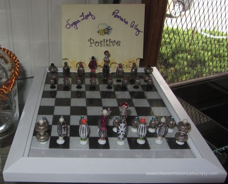 A unique handmade chess set from jewelry features decorative pieces on a board, with a "Bee Positive" card behind, as displayed in the 2014 "Made in Chester" Exhibit.Category
