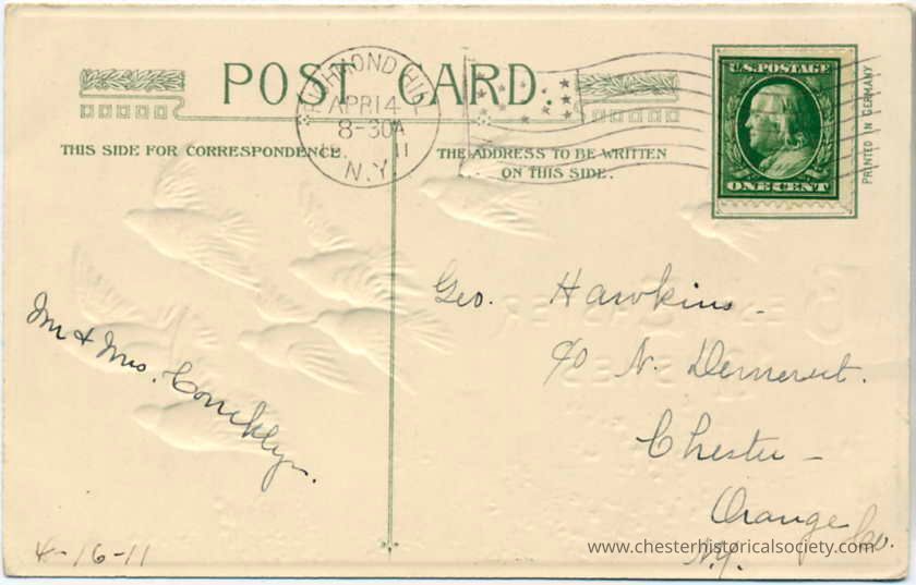 "Best EasterWishes" post card sent to Geo. Hawkins, c/o N. Demarest, Chester, Orange Co., N.Y.