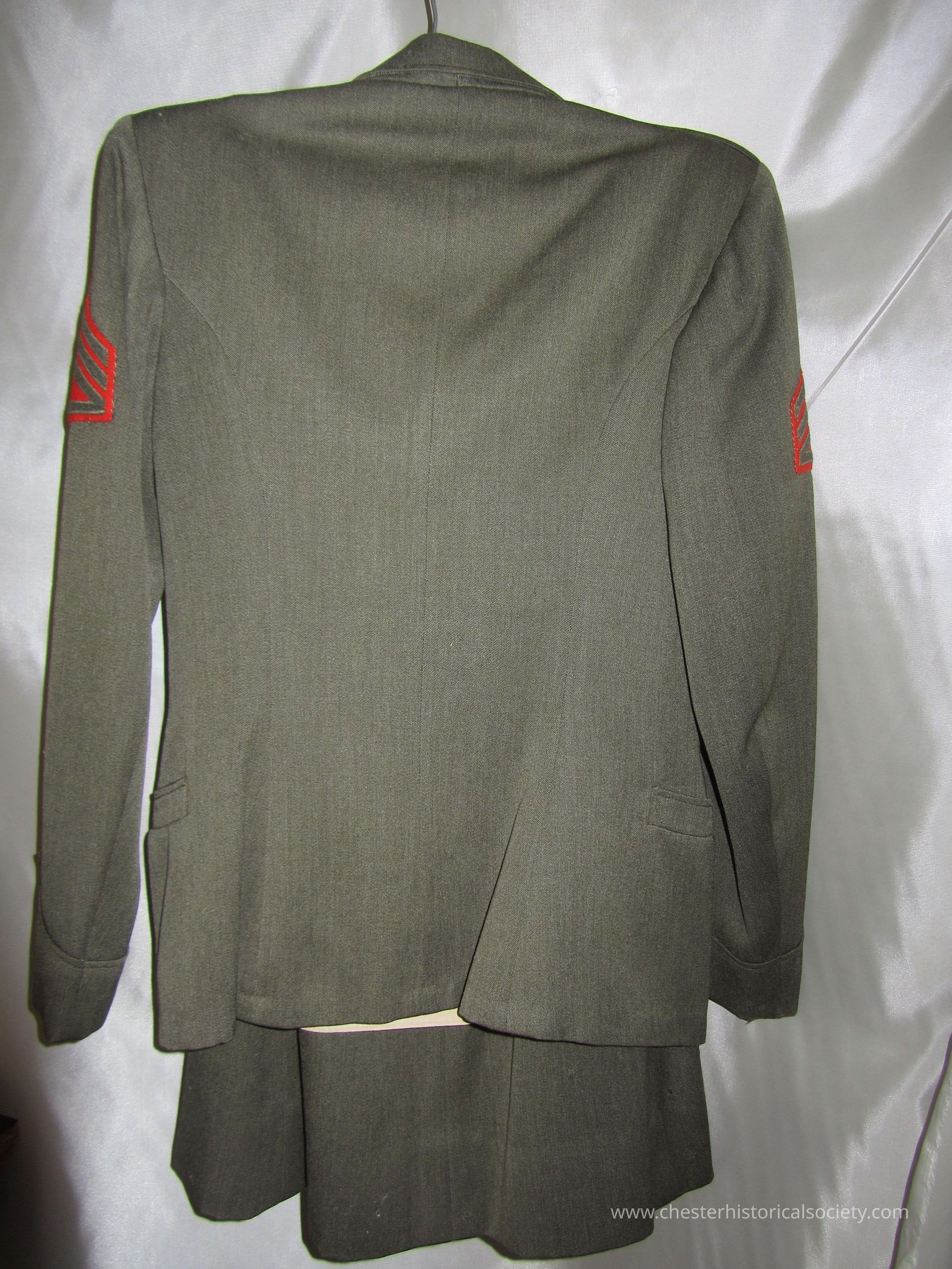 Betty Murray's WWII Marine Uniform (Shirt, blouse & jacket) showing Staff Sergeant rank, and Honorable Discharge Emblem lozenge, indicating that Betty probably wore this uniform on her way home to Chester upon discharge.Collection