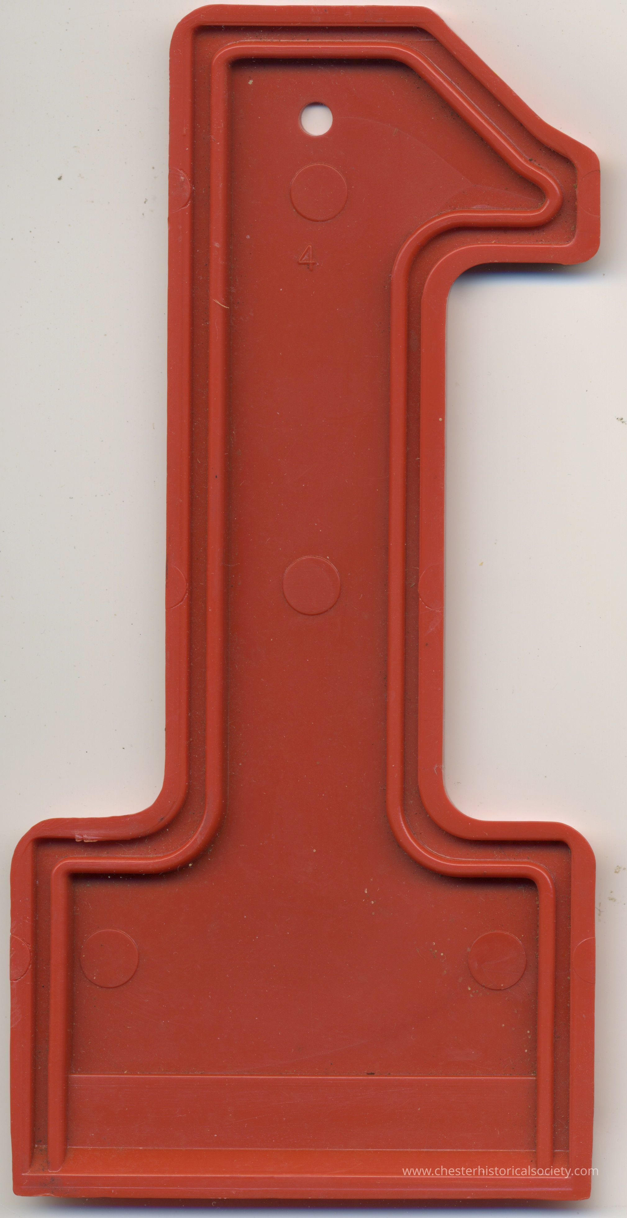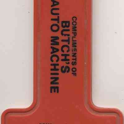 Butch's Auto Machine Ice Scraper in the form or a red, number 1-shaped promotional plastic ice scraper featuring black text that reads, "COMPLIMENTS OF BUTCH'S AUTO MACHINE," with additional contact information provided below, which includes "Millers Lane, Chester, NY 10918" and a phone number "914-469-2389"; this plastic tool appears to have a hole for hanging at the top and a serrated edge for scraping ice at the bottom, implying its intended use as a practical giveaway item from a local business.Category