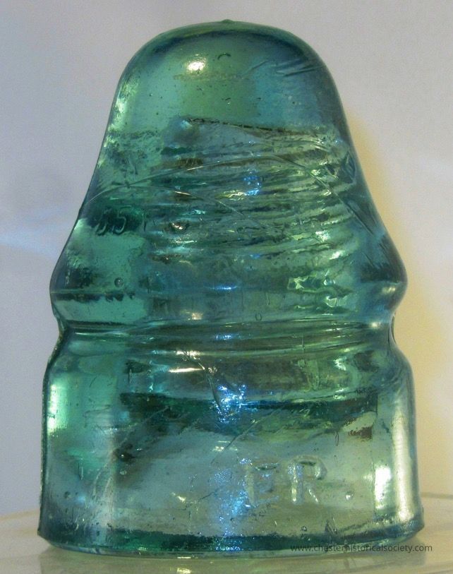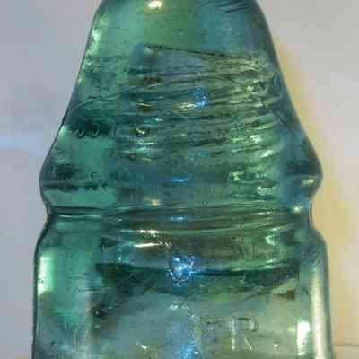 A vintage, glass insulator with a teal hue, made by the Brookfield glass company. Used historically on telegraph lines of the Erie Railway.Use