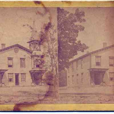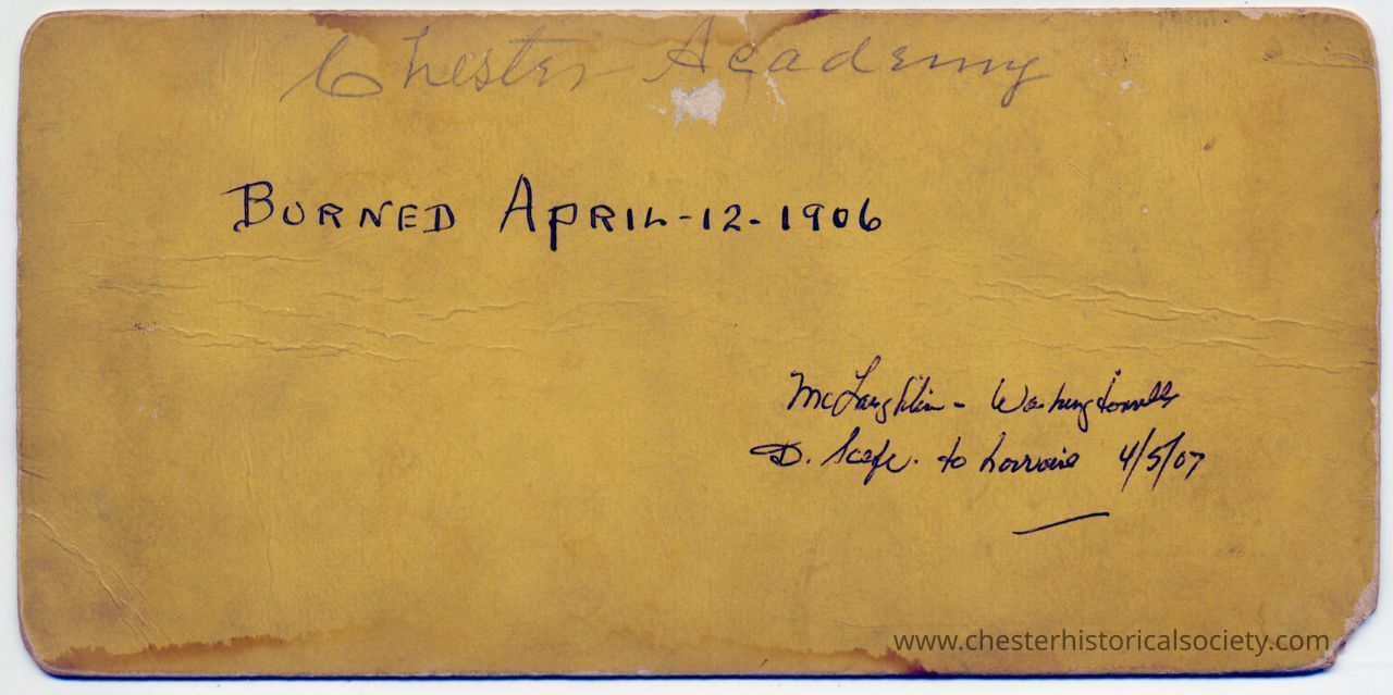 The Chester Academy before the addition was added. The Chester Academy was built in 1846, at a cost of $10,000. It was a frame building 50 by 75 feet standing at the corner of Academy Avenue and the Goshen Road, now, 2006, called Brookside Ave. (Route 17M). A 25 foot long addition was added in 1875, the expenses amounting to $5,000. It then accommodated 275 scholars. On the morning of April 9th, 1906, at about one-o'clock the Chester Academy burst into flames, and, in a comparatively short time, was reduced to ashes. Aside from a few rescued books, the only other surviving artifact was the school bell, now resides in the lobby of the new Chester Academy, which opened in 2004. Note Type