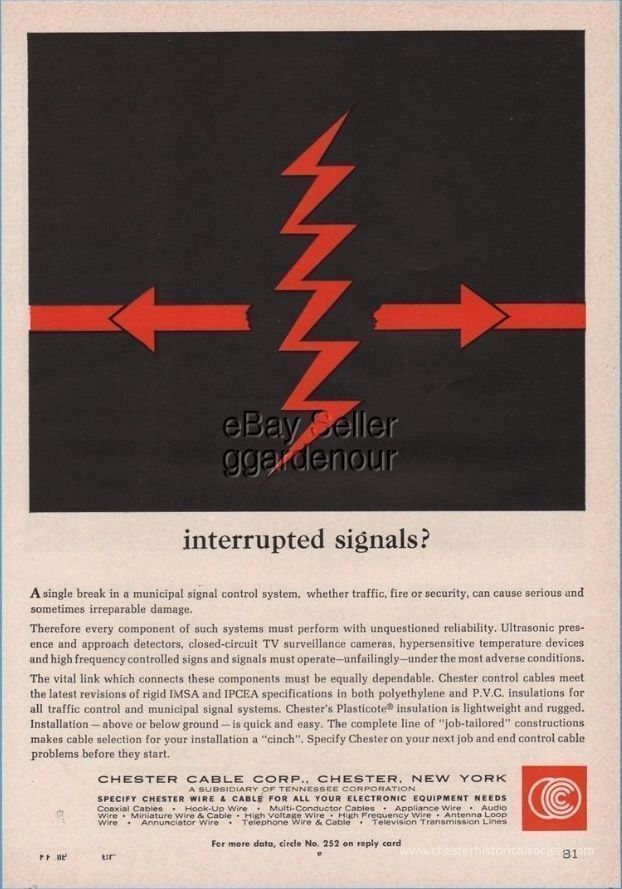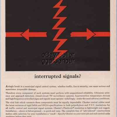 An advertisement offered for sale on eBay featuring a black background with a red zigzag line interrupting a straight red arrow, accompanied by the words "interrupted signals?" in lowercase. Below the image, a block of text explains the importance of reliable signal control systems in municipal settings, highlighting products offered by Chester Cable Corp., such as "Plastitec" insulation, ideal for high-frequency controlled signs and signals. The ad emphasizes specifying Chester for end control cable needs and includes details about their offerings.Category