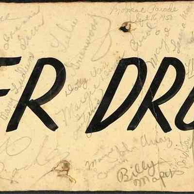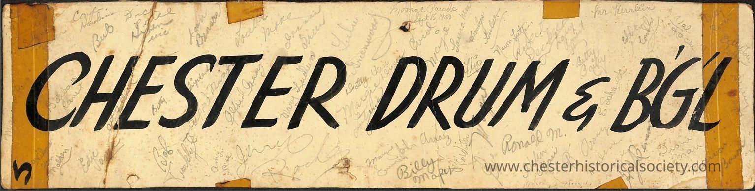 This, vintage paper sign with the bold text "CHESTER DRUM & B'GL" in large, black, capital letters at the center. The background is a yellowed, aged paper. Surrounding the central text are numerous handwritten names and signatures of cor members in a variety of cursive styles, used to memorize the 1950 Memorial Day Parade participants. The edges of the paper are taped with brown tape, showing signs of wear.Collection