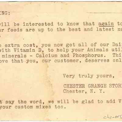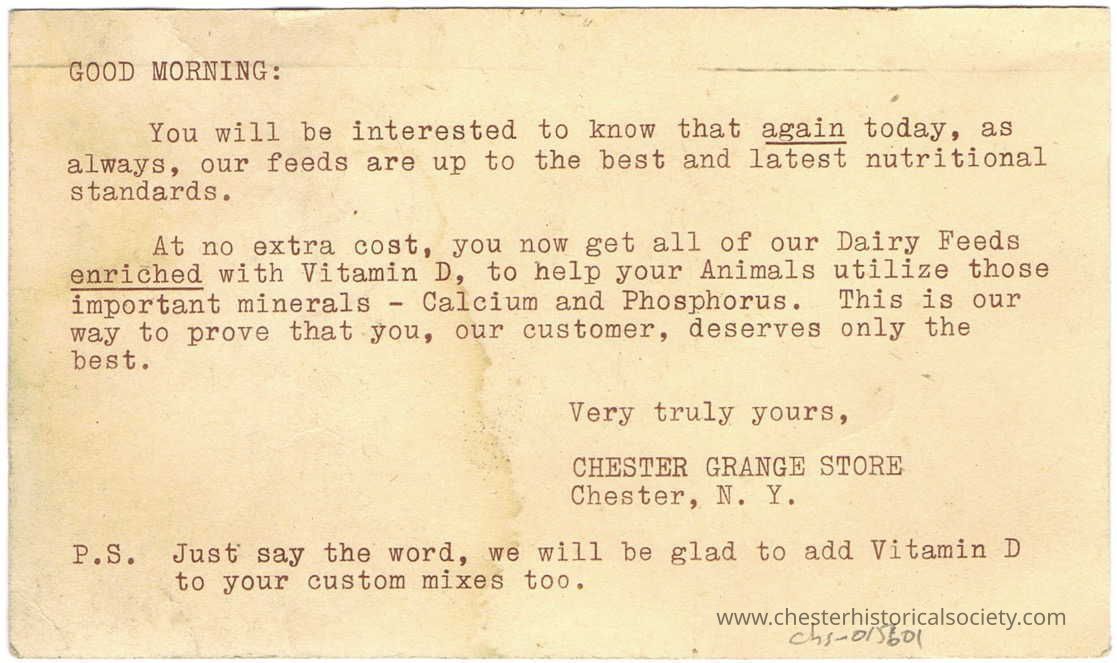 This postcard with an address and a preprinted green postage indicium carries a typewritten message that begins with "GOOD MORNING:" and is addressed by the Chester Grange Store in Chester, N.Y. The letter informs the recipient about the latest nutritional improvements in their animal feeds, which now include Vitamin D enrichment at no extra cost. It underscores that these feeds are also fortified with important minerals like Calcium and Phosphorus, emphasizing the company's commitment to offering only the best to its customers.Subject Person/Organization