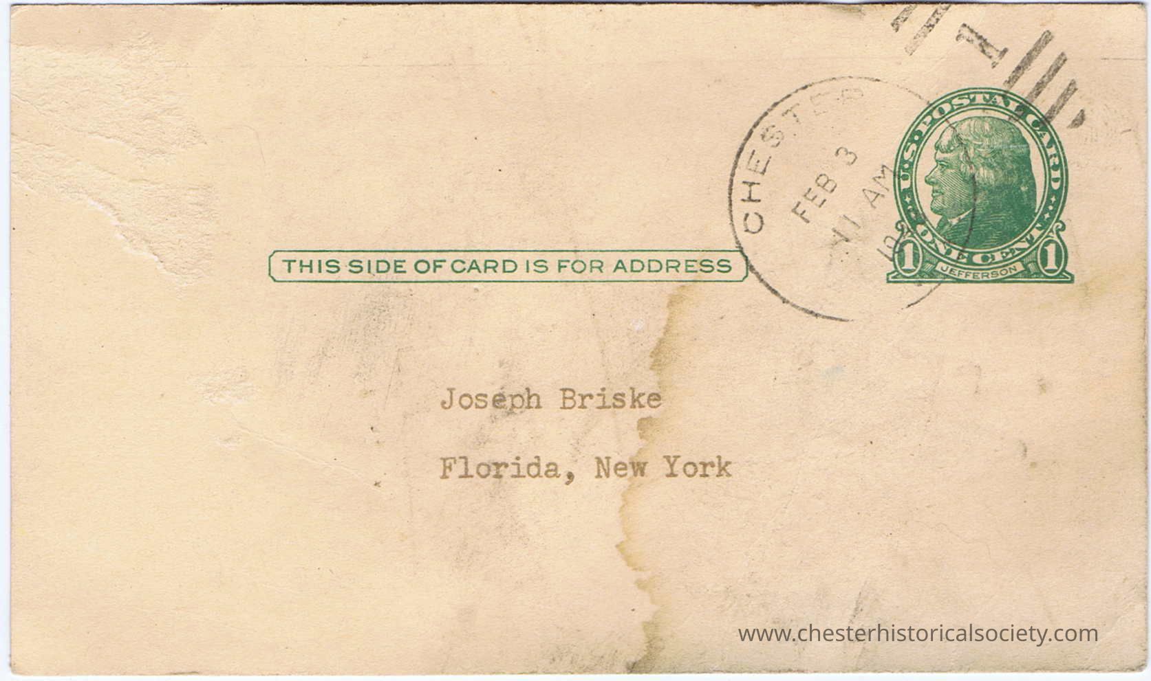 Chester Grange Store postcard to Mr. Joseph BriskieCreate Date