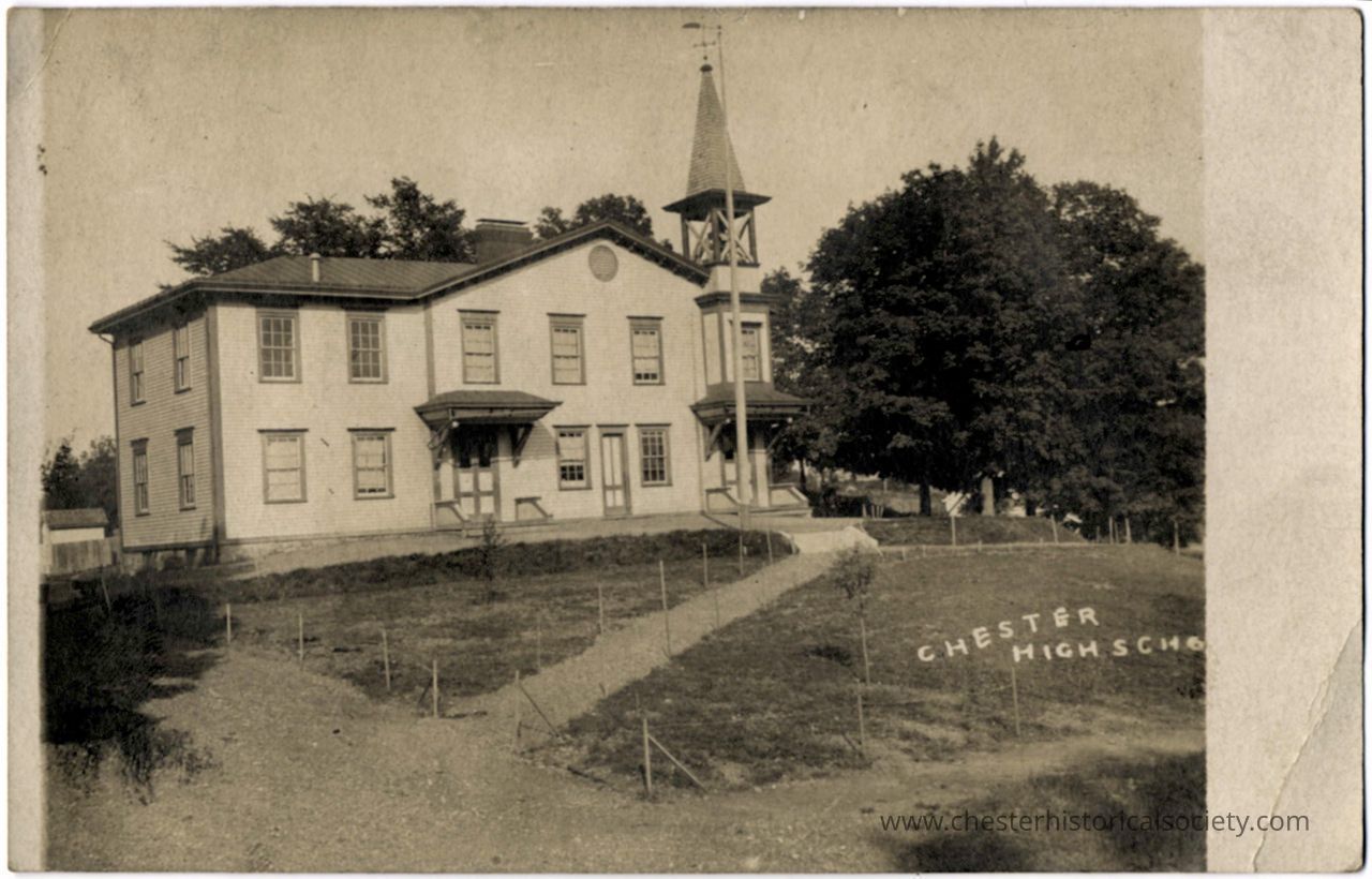 This monochrome photo postcard depicts 1846 Chester Academy, labeled here "Chester High School," a historic building characterized by its two-story white structure with distinctive features like a bell tower, and dual covered entrances. It is situated on a grassy slope with a small path leading up to it, surrounded by trees, capturing a serene, educational environment from a bygone era. The sepia tone of the photograph adds a nostalgic touch, emphasizing its historical significance and the early architectural style of educational institutions.
