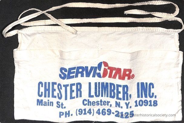 A white Chester Lumber Apron with two tie strings and multiple pockets, featuring the blue and red logo "SERVISTAR" prominently displayed; below it, the text reads "CHESTER LUMBER, INC." with the address "Main St. Chester, N.Y. 10918," and a contact number "PH. (914) 469-2125" printed in bold blue letters.Category