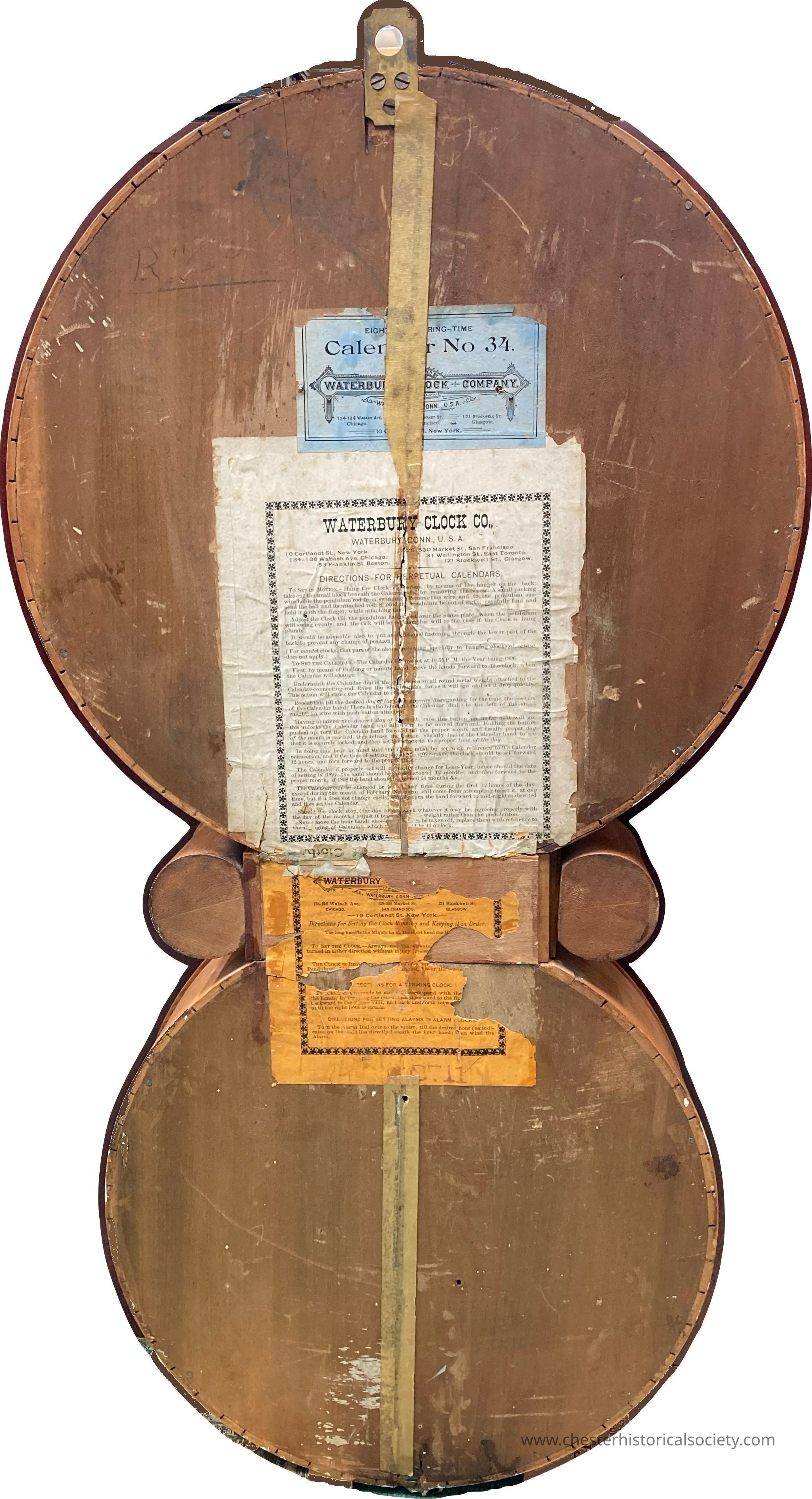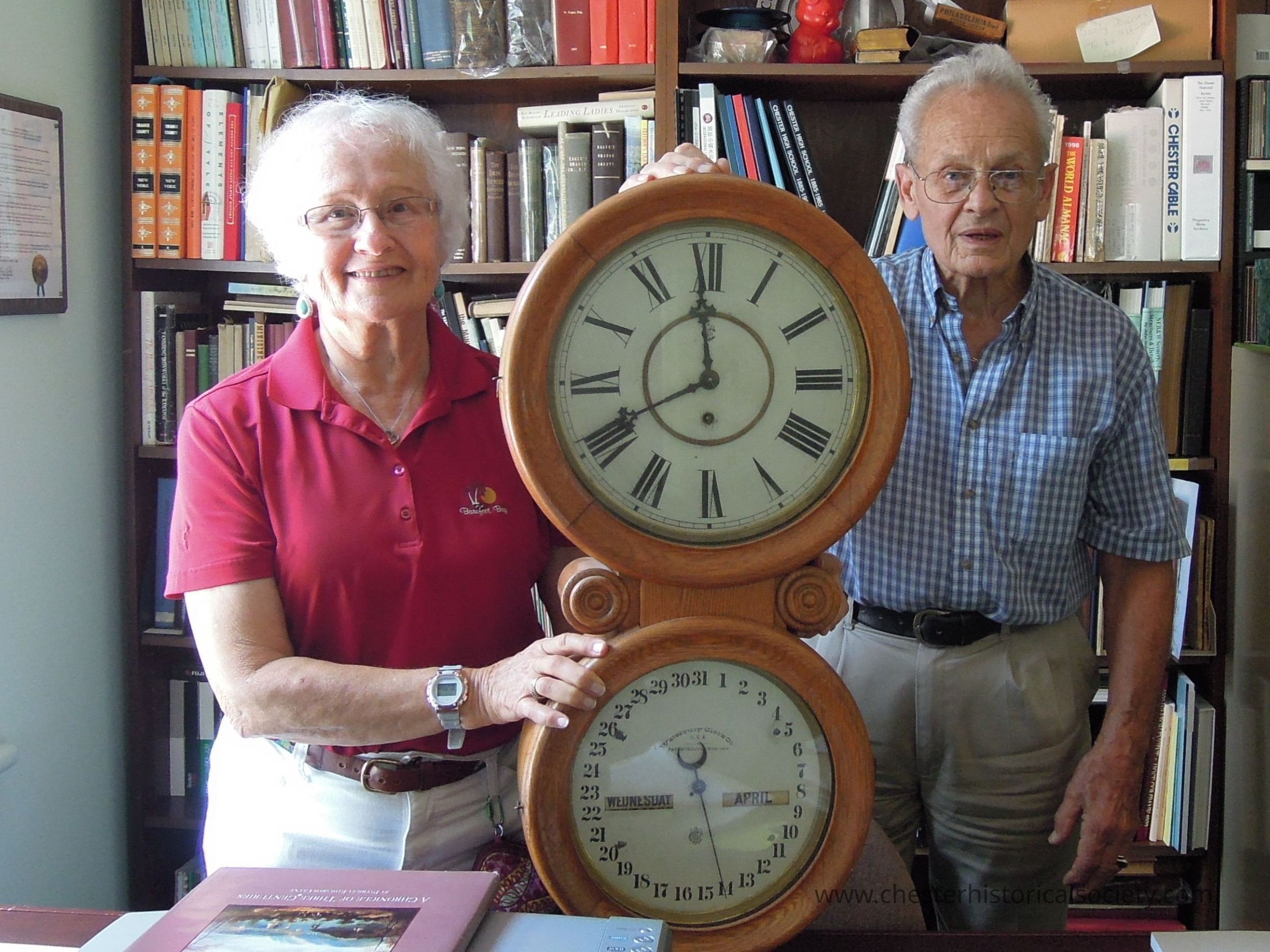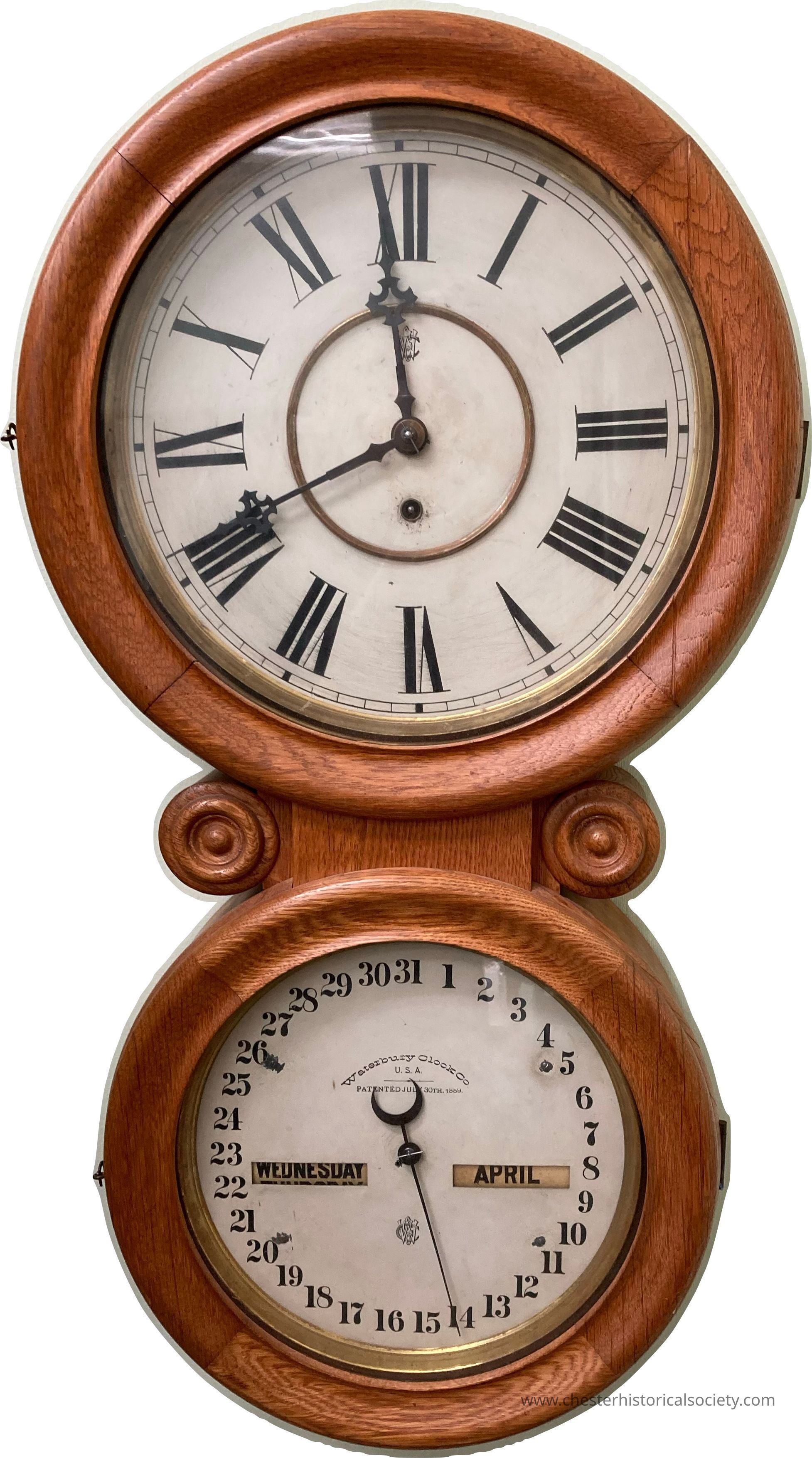 A few months ago, I mentioned during a meeting that I'd received a call from Louise Urbanski Hirst. She wanted to donate the clock that was in the Board Room of the Chester National Bank (now Village Hall) to the Chester Historical Society. This morning, I met Louise and her husband John. They are up from the State of Florida visiting her brother in Pine Island, her hometown. She gave me the clock. It is a Waterbury Clock-Calendar #34, circa 1893. It is an 8-day time, in an oak case, measures 29 1/2 inches in height. It is valued at about $1800. She asked that the clock not be sold but be kept by the Society. I filled out the donation form and the clock is in the office in Village Hall. Caution: it is a wall clock and must remain upright.