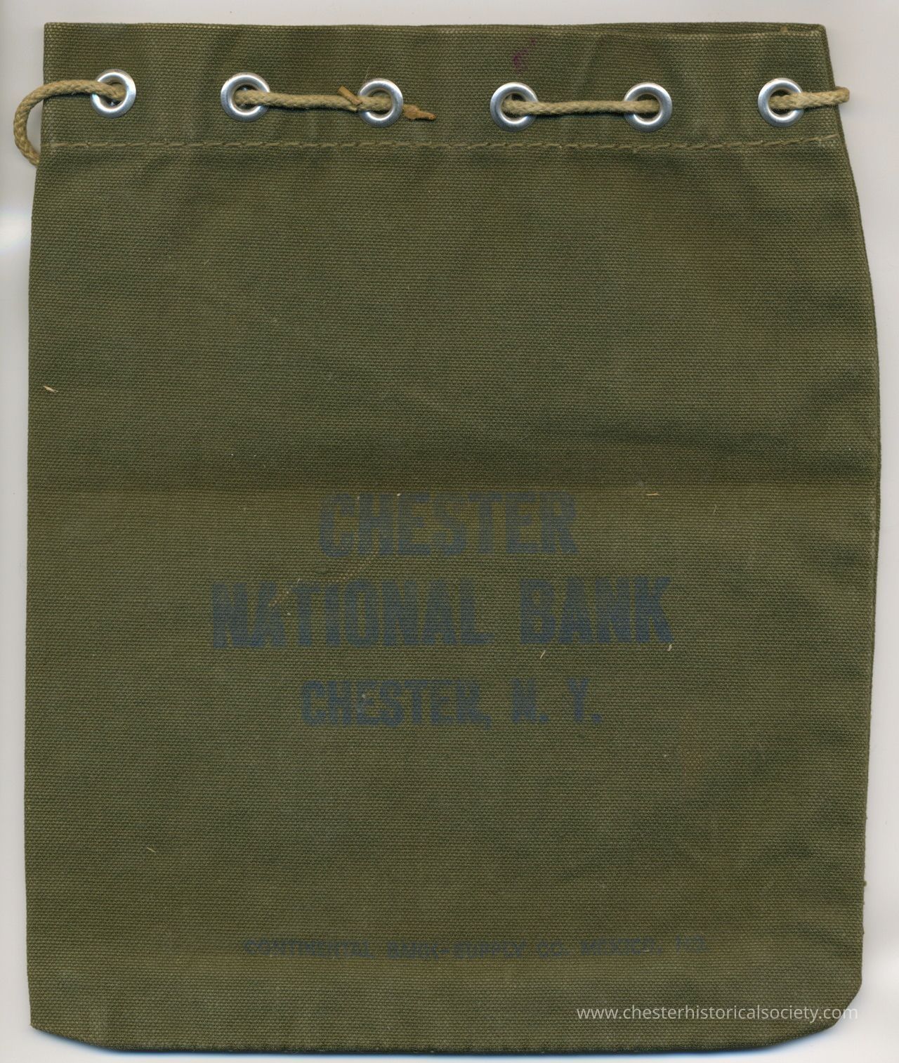 Chester National Bank canvas bag with drawstring closure for transporting coin and currency to and from the bank.