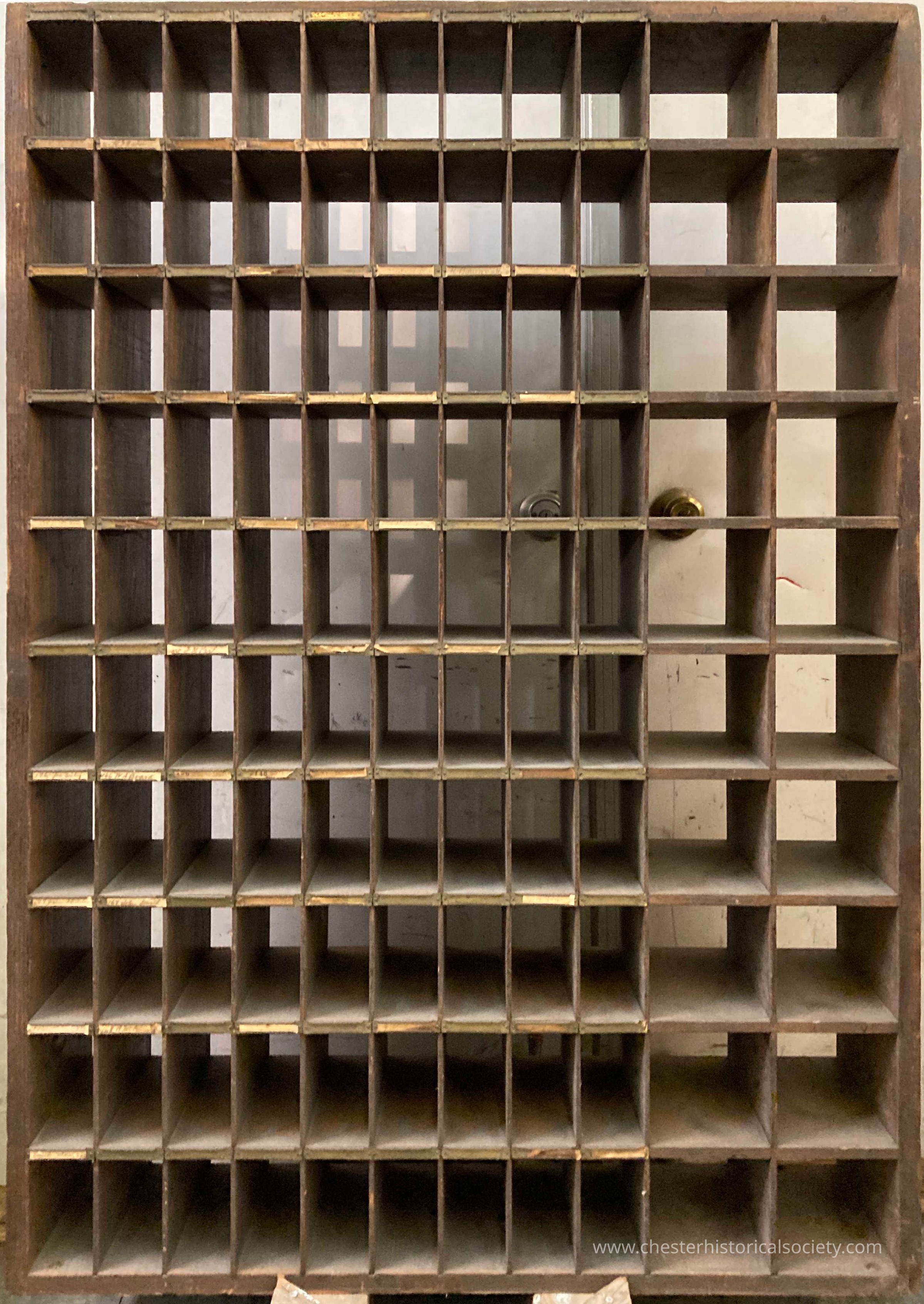 Circa 1900 Chester Post Office Mail Sorter: an empty wooden grid shelf with numerous rectangular compartments.Category